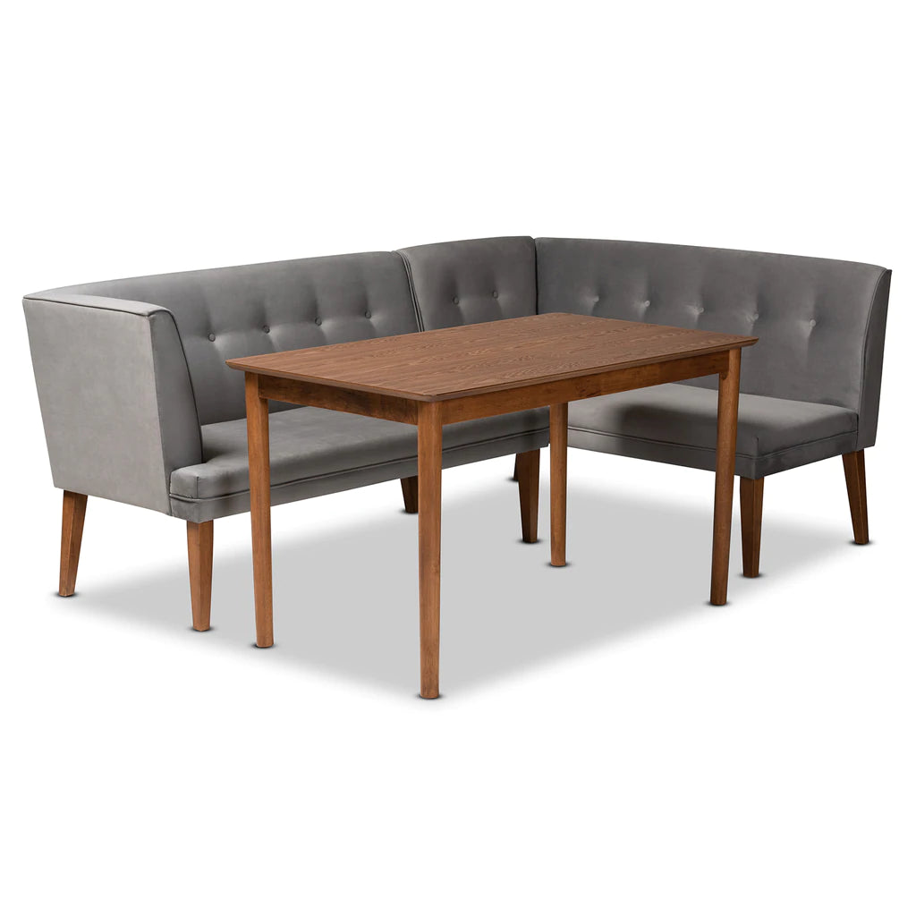 Baxton Studio Stewart Mid-Century Modern Grey Velvet Upholstered And Walnut Brown Finished Wood 3-Piece Dining Nook Set