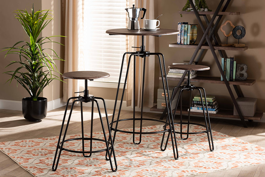 Baxton Studio Veera Vintage Industrial Rustic Walnut Finished Wood and Black Metal 3-Piece Height Adjustable Bar Pub Set
