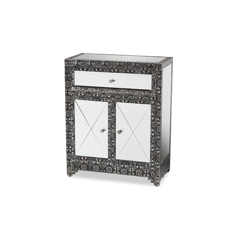 Introduce a bold statement of modern glamour to your space with the extraordinary Wycliff sideboard. Made in China, this stunning piece is comprised of a solid wood frame adorned with an embossed metal trim featuring a floral pattern. One drawer offers space to organize utensils, while the shelf behind the doors accommodates larger items. The Wycliff will arrive fully assembled and features mirrored glass panels that highlight the luxurious allure of the piece. Faux crystal drawer knobs lend a graceful touch, making the Wycliff sideboard a marvelous addition to any dining arrangement.