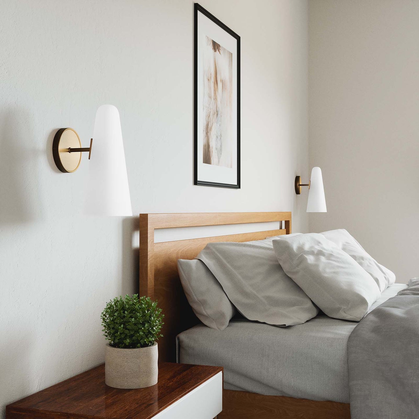 The Beacon Wall Sconce updates a living space, bedroom, dining room, bathroom, hallway, entryway, or office with minimalist sleekness that makes a modern statement. Offering a warm glow through its slim glass cone shade, this wall light is mounted to the wall by a round backplate and requires one E26 bulb 60W max or LED equivalent (not included). ETL Listed for Damp Locations. Luminaires that are “Suitable for Damp Locations” are approved for areas that are regularly exposed to moisture and condensation. Professional installation required.