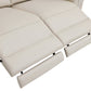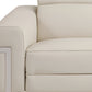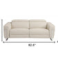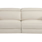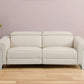 | Power reclining sofa in elegant beige upholstery with stainless steel legs. |