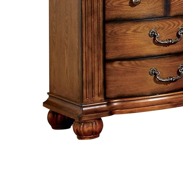 A Luxurious Masterpiece Set In Antique Tobacco Oak Finish, This Elegantly Carved And Designed Night Stand Brings A Level Of Sophistication. French Dovetail Drawers With Antique Gold Hardware Add Functionality And Style To This Beautiful Bedroom Piece.