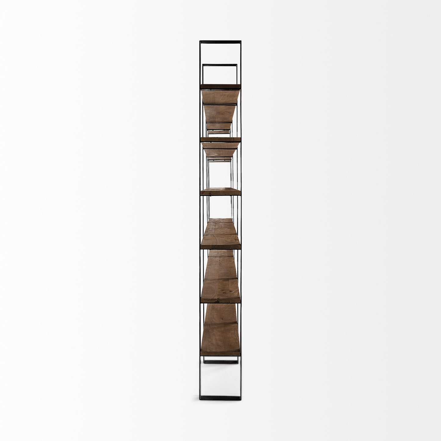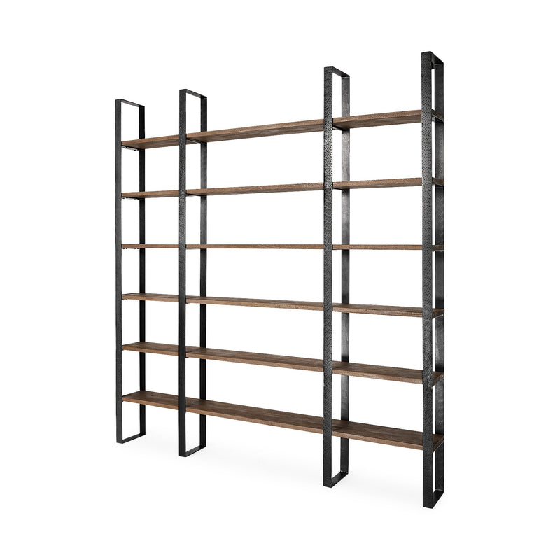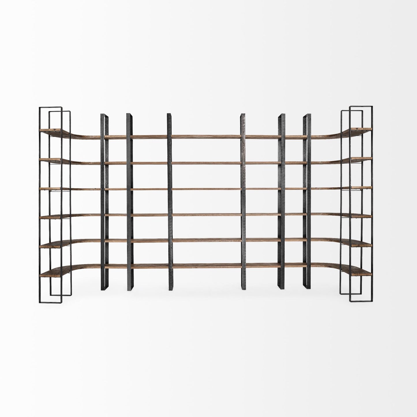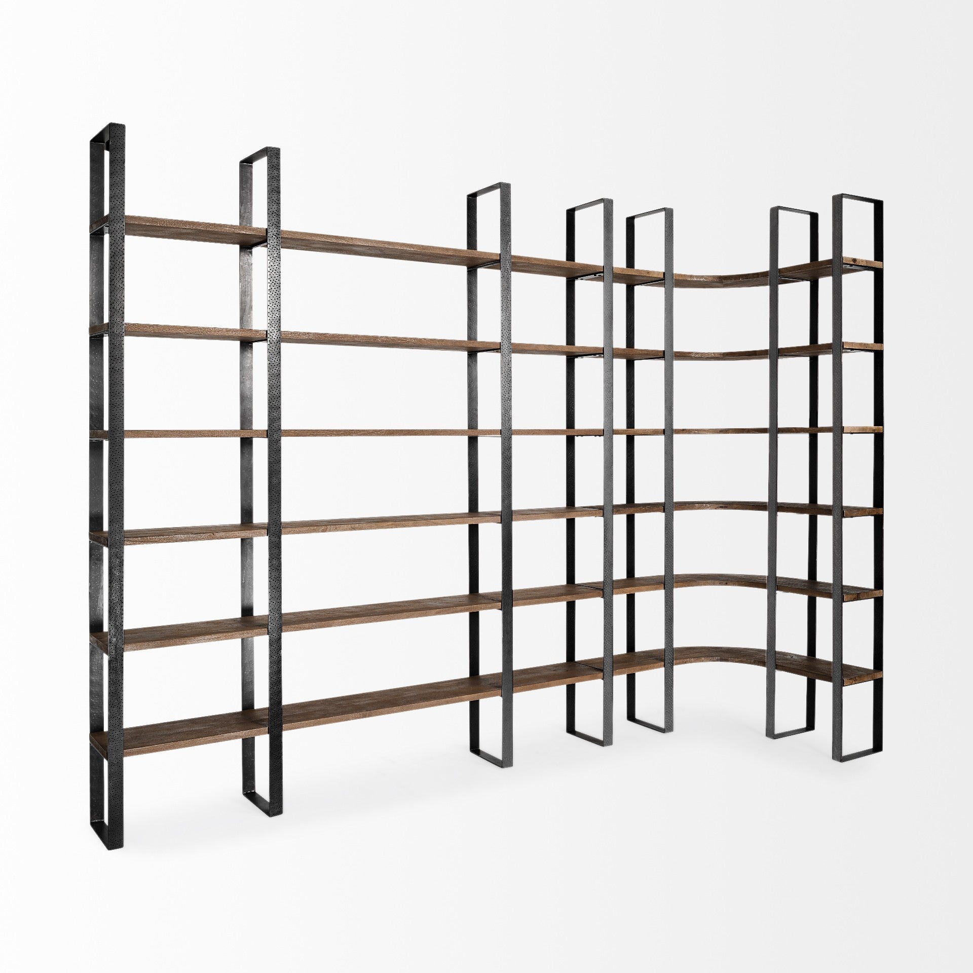 This Black Iron Framed Wooden Shelving Unit is the perfect way to add some contemporary design mixed with practical utility to your home. This shelving unit has a black iron frame with two side edges and two pieces in the middle. The shelves are made of solid wood and have a smooth brown varnish on them which show details and wood grain through them. This shelving unit will look great with decor pieces, books and even plants on it. The neutral colorway and the minimal design will look good in any room of your home and will elevate the whole space. Use it in your living room, your library, or your home office to keep the clutter away and add some design at the same time. 89.76" H x 84.05" W x 12" D