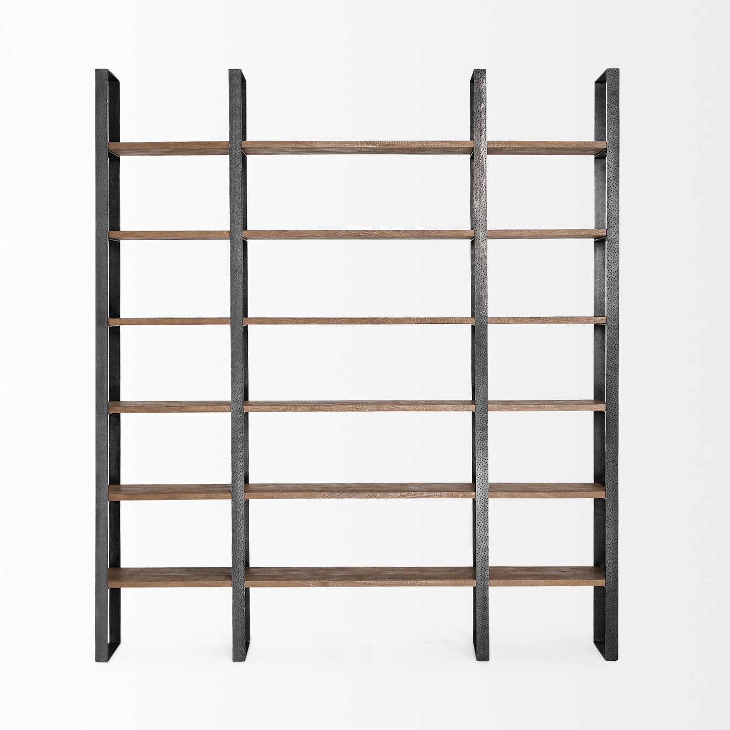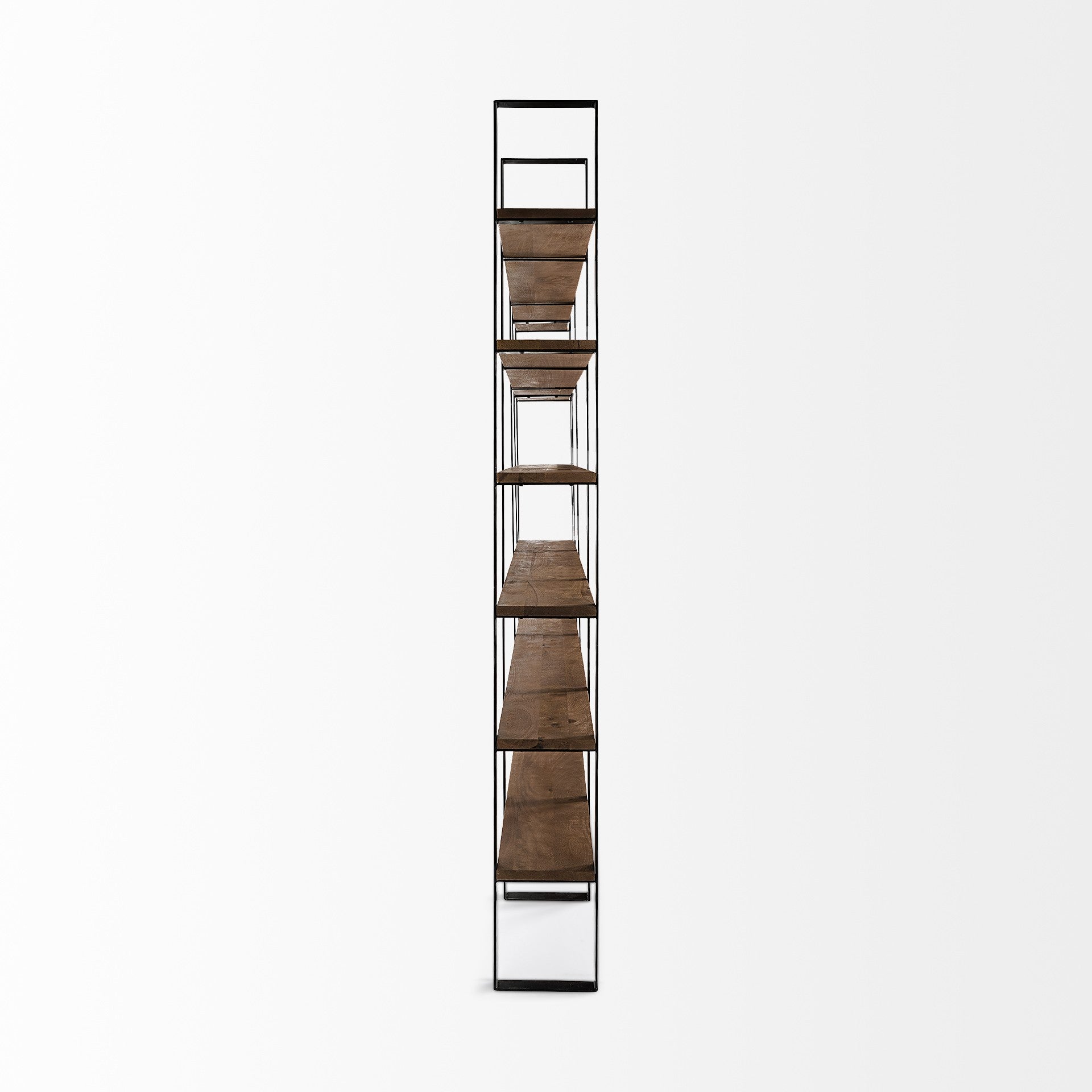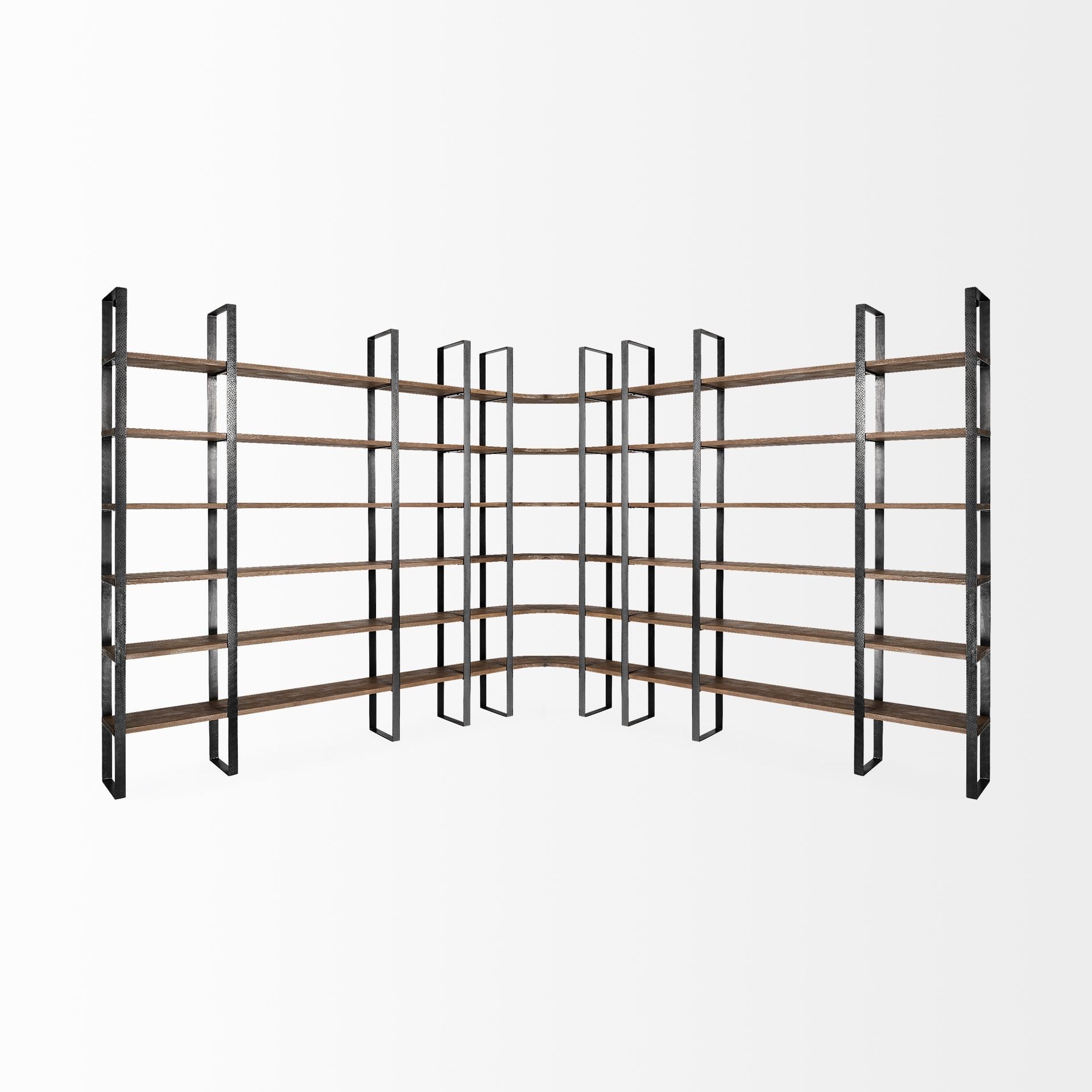 This Black Iron Framed Wooden Shelving Unit is the perfect way to add some contemporary design mixed with practical utility to your home. This shelving unit has a black iron frame with two side edges and two pieces in the middle. The shelves are made of solid wood and have a smooth brown varnish on them which show details and wood grain through them. This shelving unit will look great with decor pieces, books and even plants on it. The neutral colorway and the minimal design will look good in any room of your home and will elevate the whole space. Use it in your living room, your library, or your home office to keep the clutter away and add some design at the same time. 89.76" H x 84.05" W x 12" D