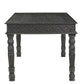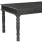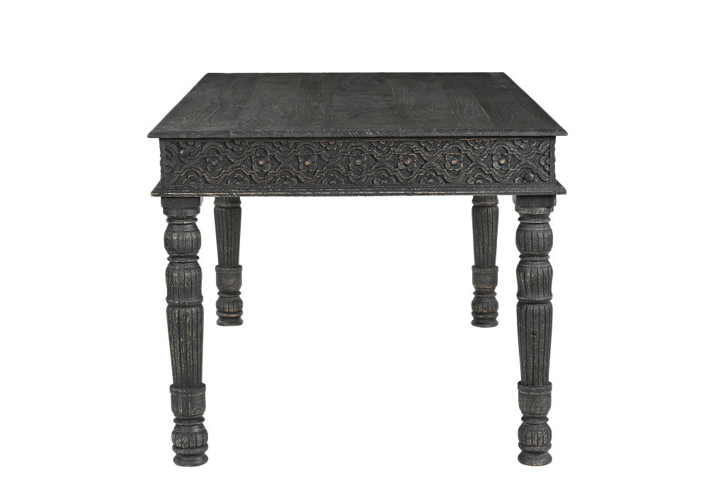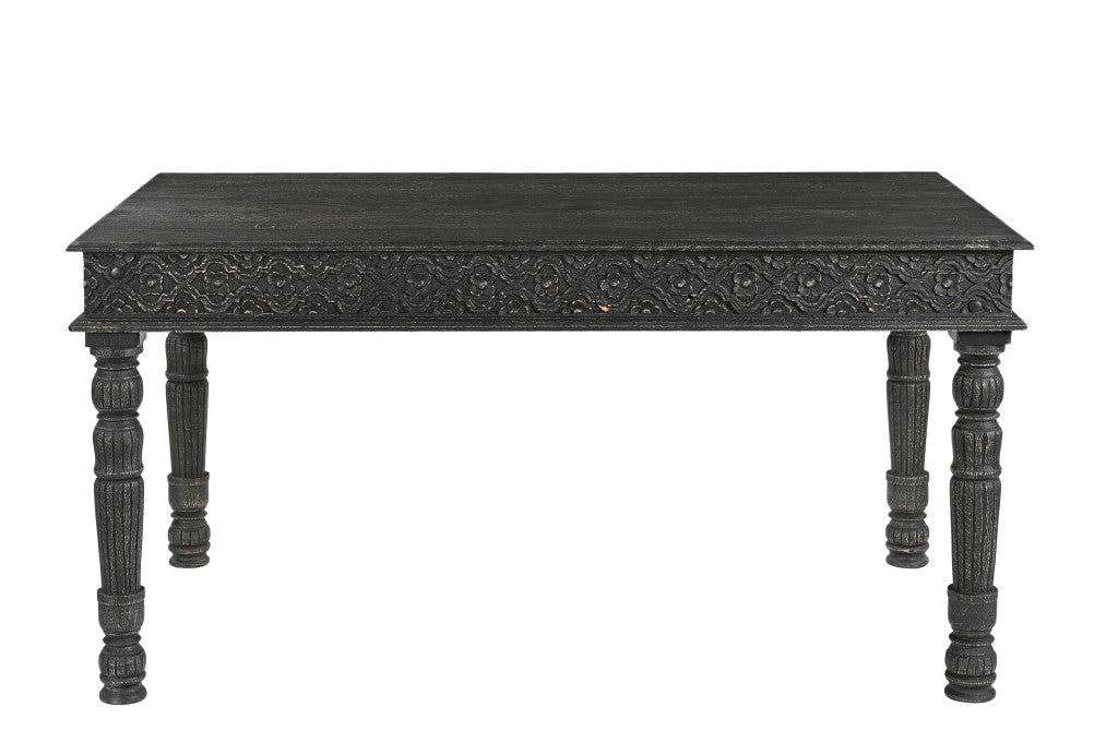 | Rustic and Vintage style weathered black solid wood dining table with beautiful carved details and sculpted turned legs. |
