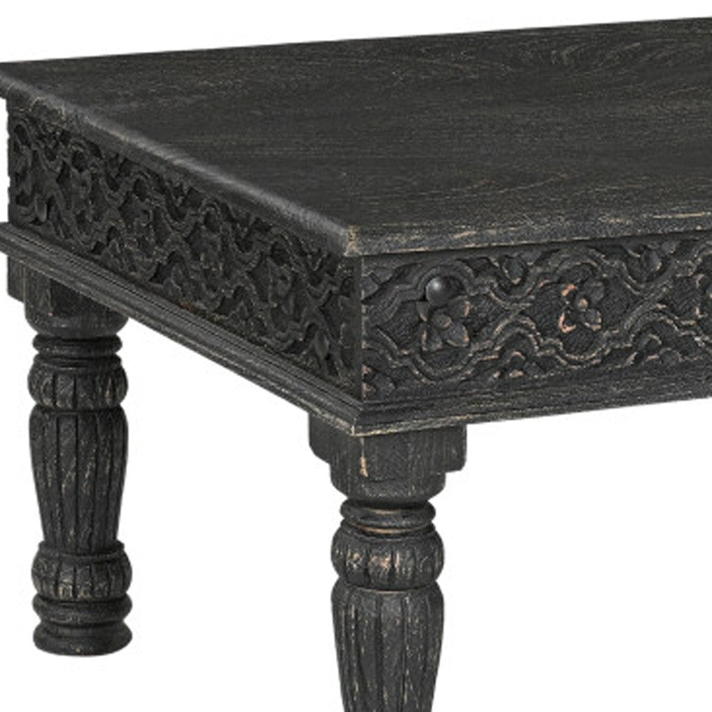 Stylish and super sturdy, the 51-inch black solid wood distressed coffee table is an amazingly good looking coffee table that will compliment your living room. This table is made from solid wood in a black color throughout the base and top. Complete with a purposefully distressed finish, this table has an aged, vintage, and rustic feel. This classic rectangular table will be a great accent in any room if you're looking for something that can fit into a living area, bedroom, or office, this coffee table is for you. 18-inch h x 51-inch w x 26-inch d.