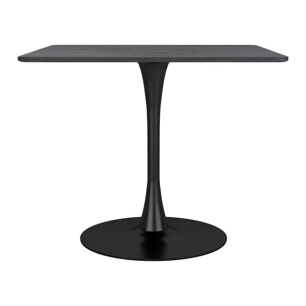 The perfect way to add a touch of minimalist design and utility to any dining space in your home this Square Black Dining Table will look great with any colors or interior style you may already have. The base of the table is made from steel which has a shiny black finish on it. The round base has a tapered pedestal attached to it which then holds the table top in place. The wooden table top has a square shape and a black colored varnish that shows through the natural grains of the wood. This simple table will look great in your dining room your kitchen or any other room of your home. 29.5" H x 35.4" W x 35.4" D
