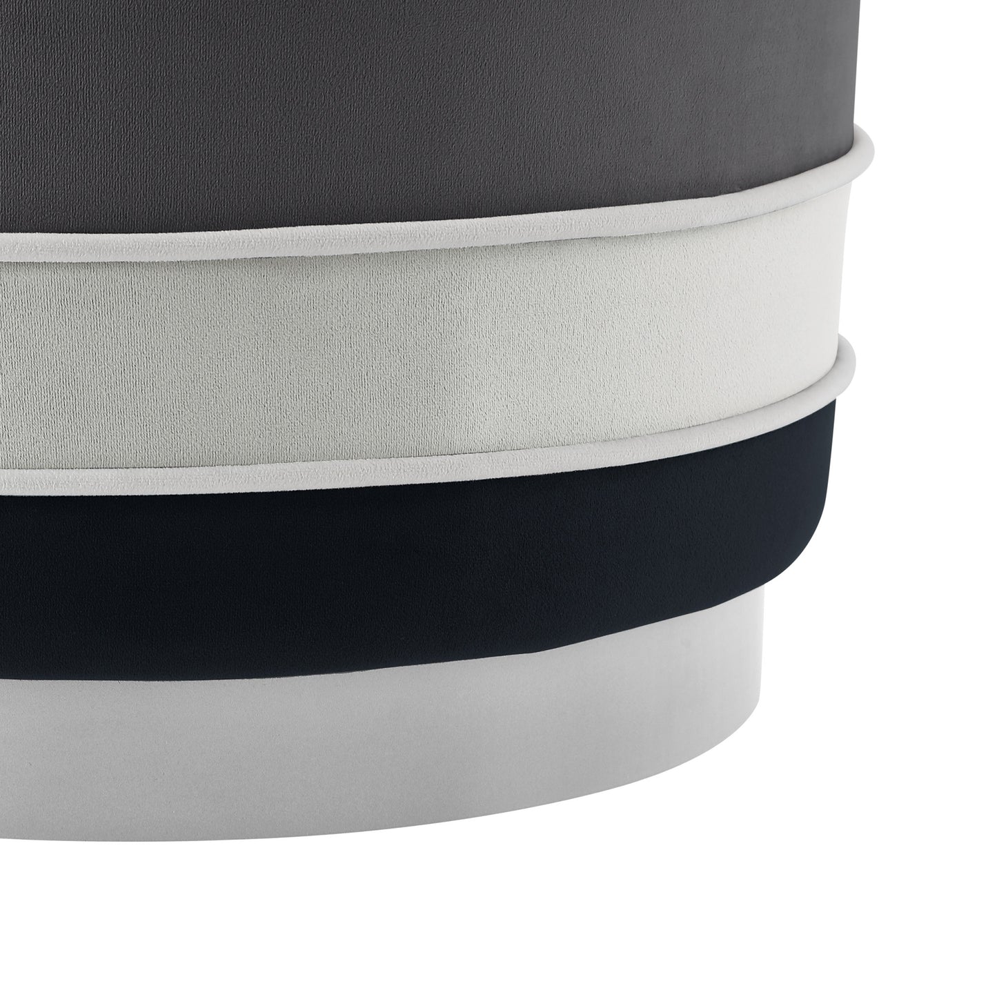 | Modern and fashionable striped velvet ottoman in shades of black and gray with gold accents. |