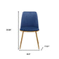 Out with the old and in with the new, this blue and gold upholstered velvet dining side chair can perfectly suit any dining table. This armless chair has a sleek silhouette making it ideal for seating around the table but can also double as an accent chair. The solid back gives this chair its unique style. Dining chairs are a great way to compliment your kitchen or dining room but can also be used in the foyer, hallway, or any room you might need extra seating. 33.66-inch h x 18.5-inch w x 17.91-inch d.