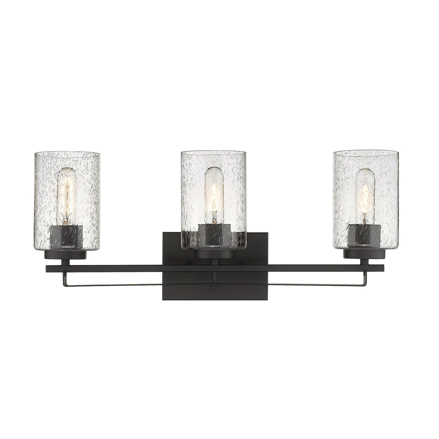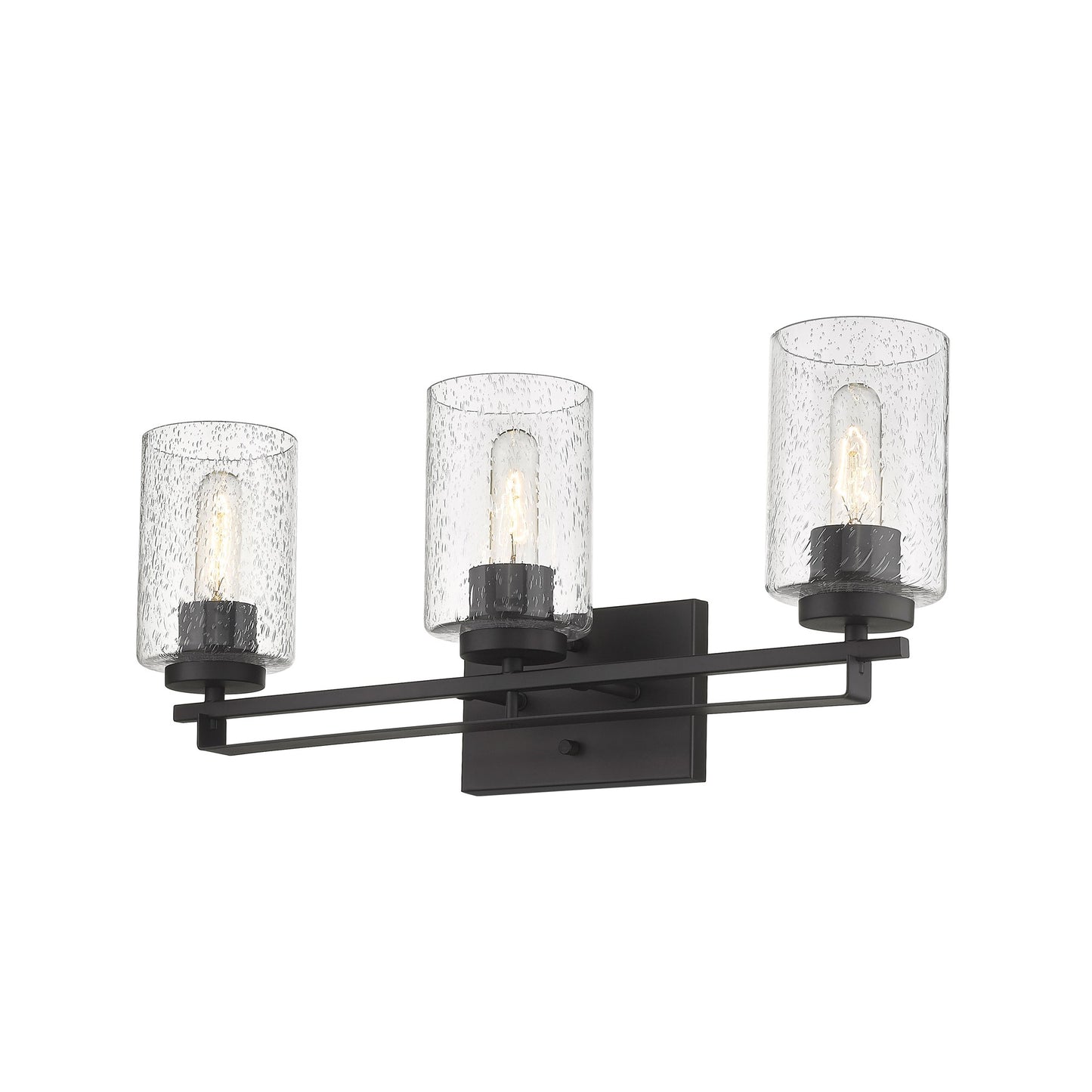 With this Bronze Metal and Textured Glass Three-Light Wall Sconce you add some style and brightness to any space in your home. The wall bracket has a rectangular shape and a bronze finish on it. There is a horizontal rod running across the wall bracket which has the three light shades attached to it. The light shades are made of solid glass with a rain drop textured effect on them. The contrast between the bronze metal hardware and the textured glass shades gives this wall sconce a very unique look. You can use this wall sconce in your hallway, your living room, or in your kitchen. 9.5" H x 24" W x 6" D