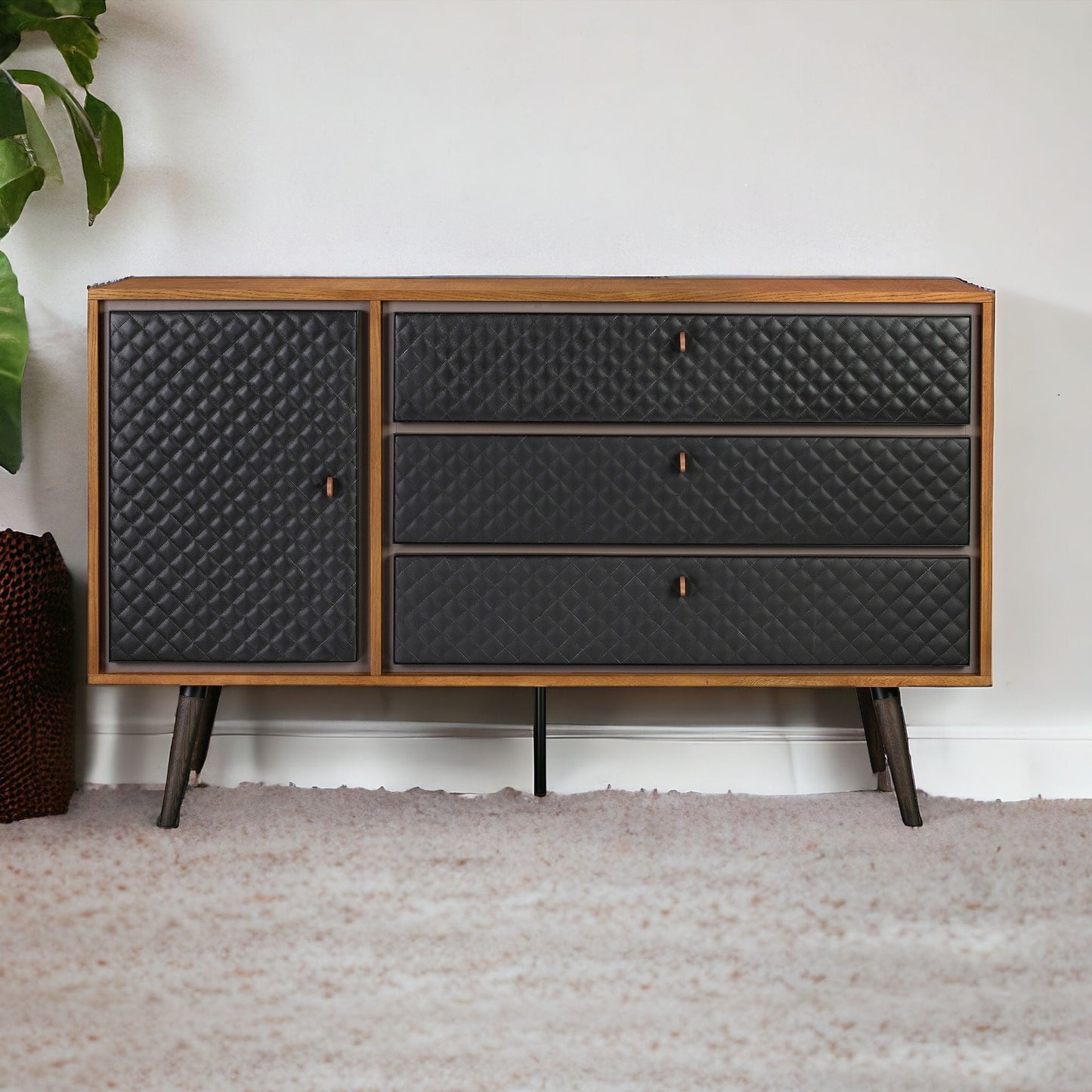 Add personality to your bedroom style and a feeling of coziness with this 63-inch brown and black solid wood three drawer double dresser. Designed for you to stand in front of and get ready, this horizontal double dresser has a convenient and wide top area for your getting ready needs and supplies. Equipped with three easy open drawers for practical and good looking clothing storage. This dresser is built to last from high quality solid wood,. 38.19-inch H x 62.99-inch W x 17.72-inch D