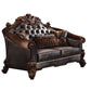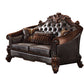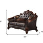 With a look and feel like leather, this 66-inch dark brown faux leather and chenille loveseat and toss pillows is made from sturdy and resilient polyurethane to stand up to the test of time. Traditional carved scrollwork detailing and rolled arms offer a comfy place to rest and give this piece some interest and shape. The tufted cushions add fine designer detailing, and are reversible for the ultimate in convenience. A great showpiece for your room, this sofa is a must have. 48-inch h x 66-inch w x 43-inch d.