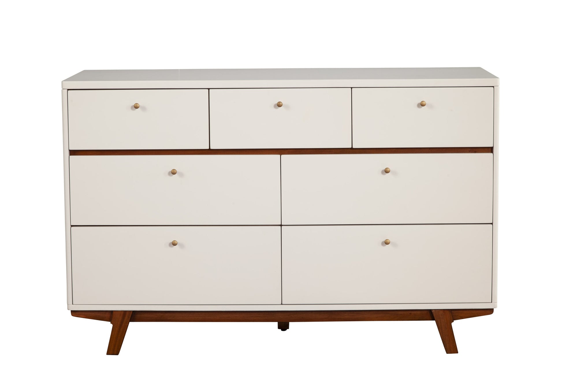| Mid-Century Modern White and Brown 7 drawer dresser. Features splayed brown wood legs for a modern flair. |