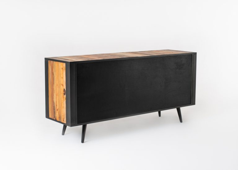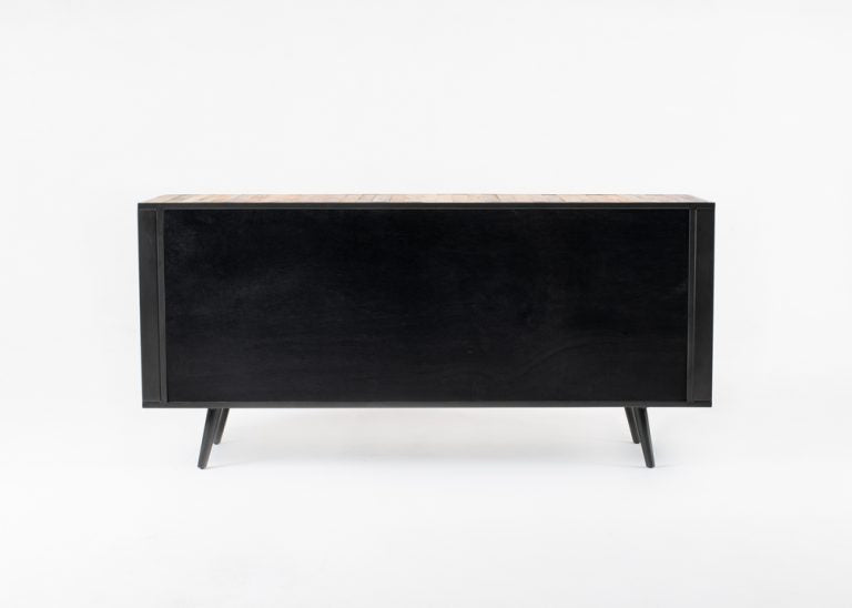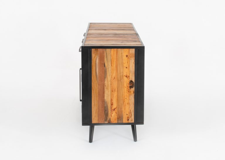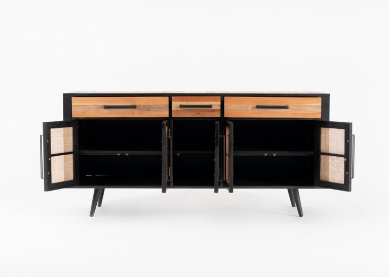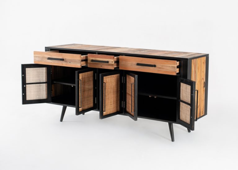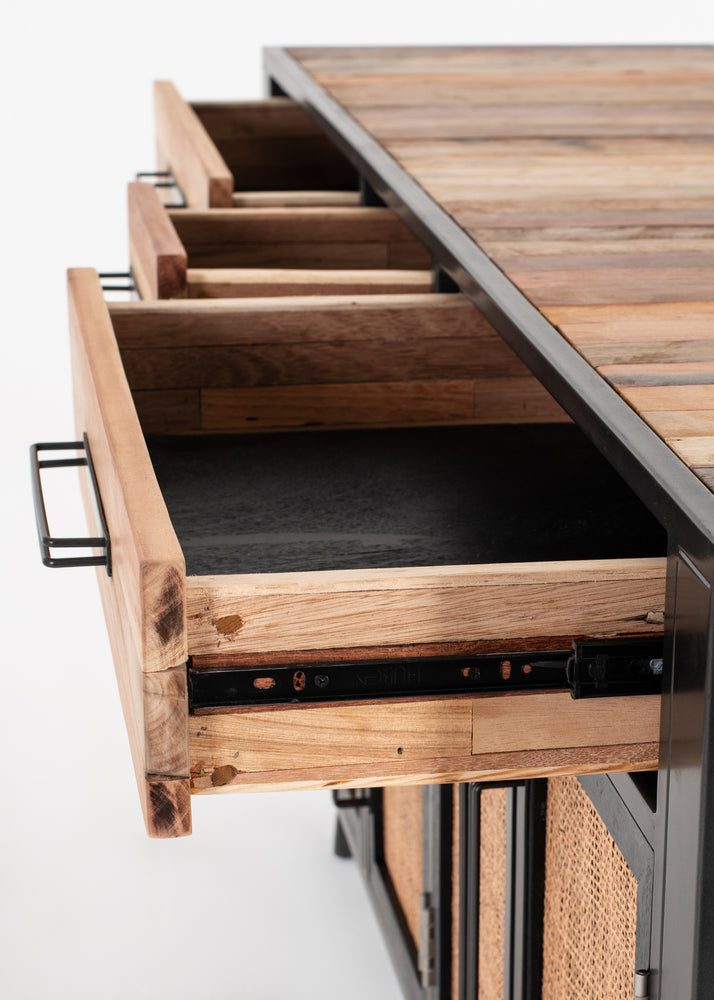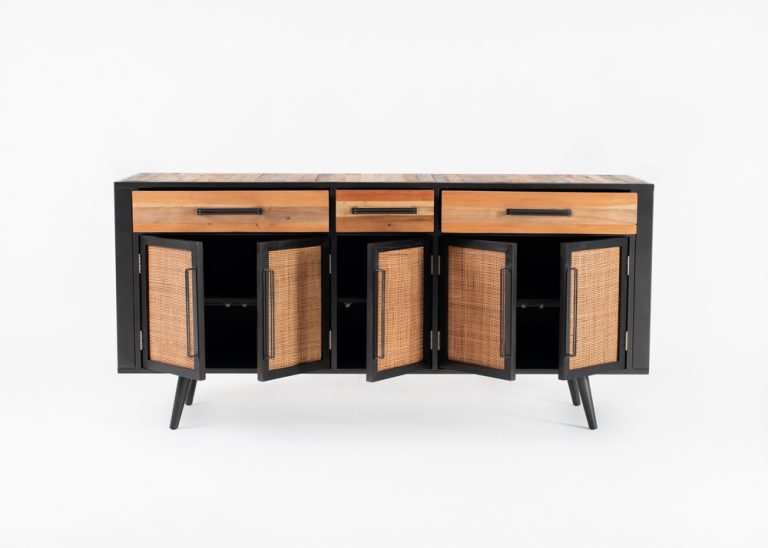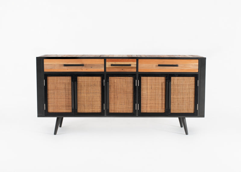 This buffet offers clever storage versatility with its combination of generous drawers and fixed shelving behind its five doors. It is the ideal piece for the living or dining room, housing kitchen utensils, linens or other household musthaves. Hand made from solid reclaimed boatwood, featuring retro-inspired iron metal legs and framing, this piece is coated with a natural transparent finish to highlight its character. Handwoven split rattan door fronts add a natural and unstructured look to each piece.