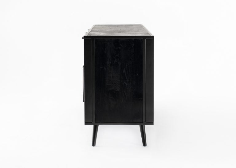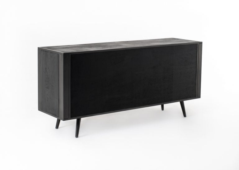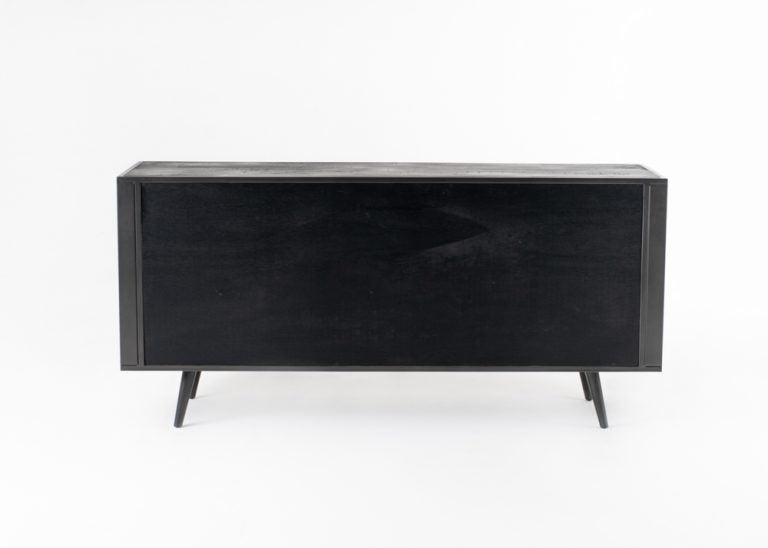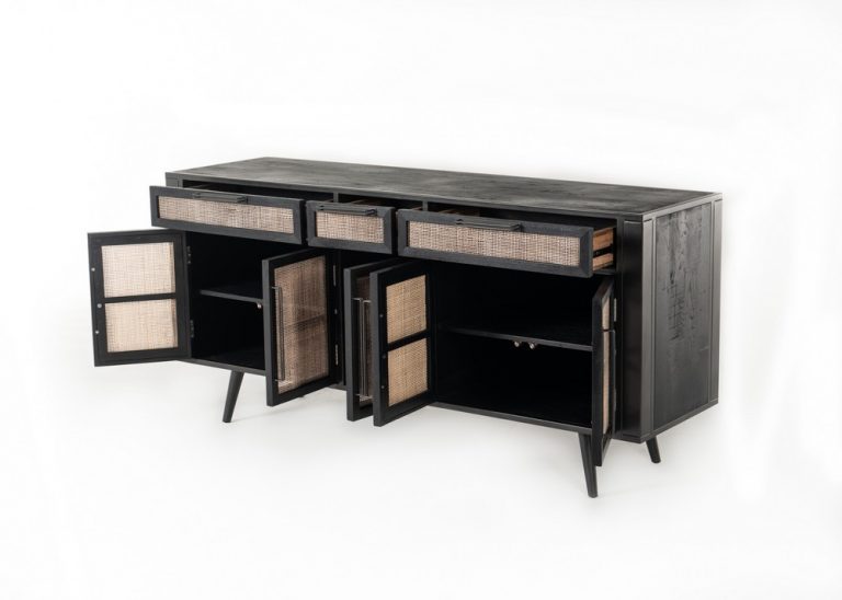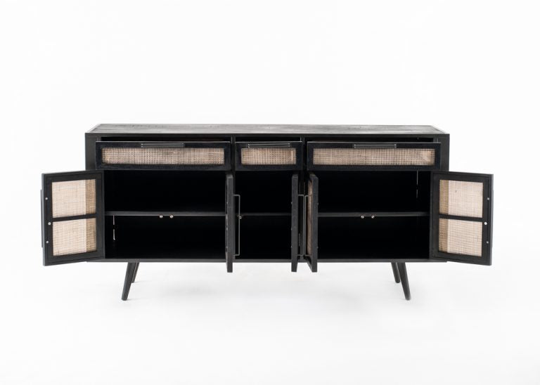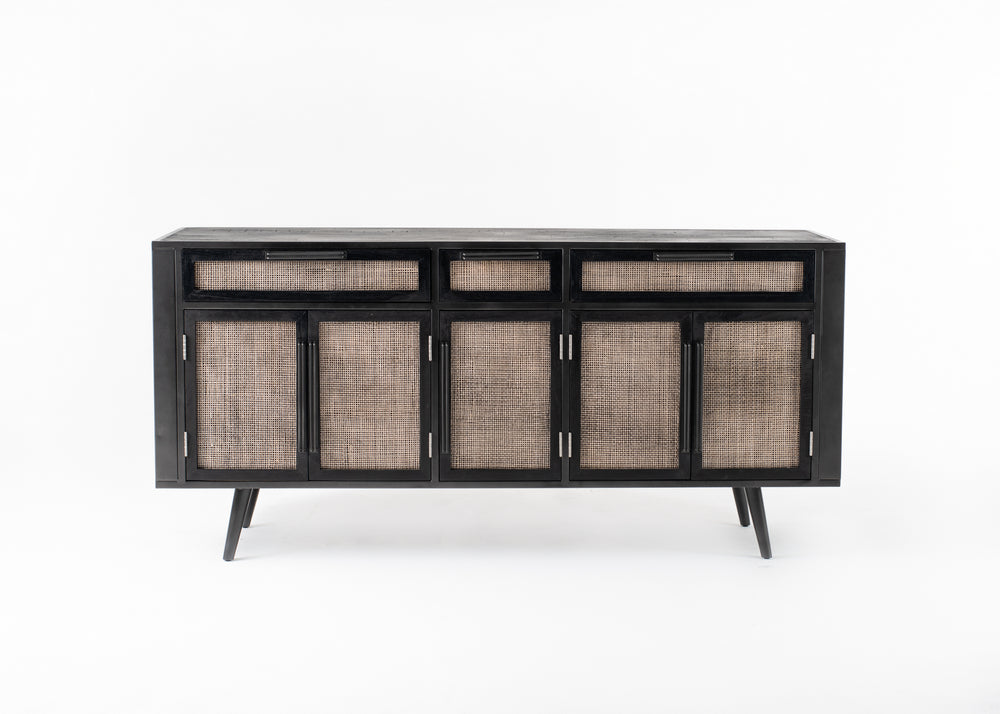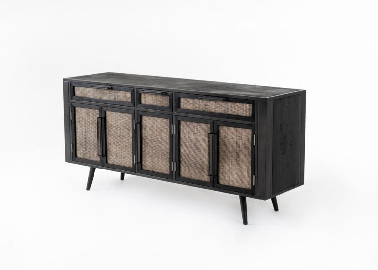 This buffet offers clever storage versatility with its combination of generous drawers and fixed shelving behind its five doors. It is the ideal piece for the living or dining room, housing kitchen utensils, linens or other household musthaves. The black water-based paint lightly reveals the rustic texture of the underlying wood. Handwoven split rattan door and drawer fronts add a natural and unstructured look to each piece.