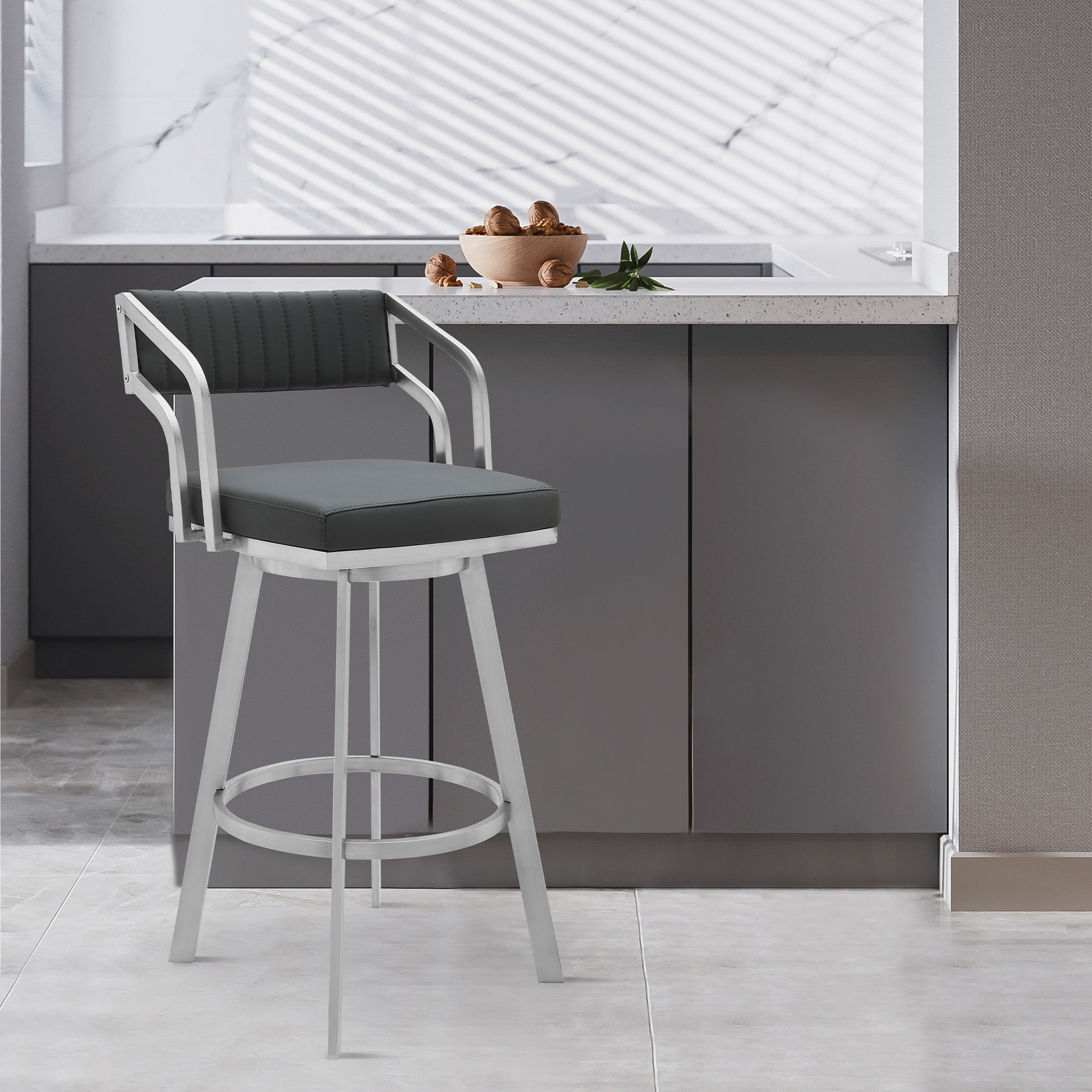 Add a modern furniture piece to your home with the Capri Swivel Modern Metal and Faux Leather Bar and Counter Height Stool. The Capri is a unique design that will be sure to start conversations at all your gatherings. Pull the Capri up to your kitchen island, counter, peninsula, bar, or pub table with ease due to the unique low arm design that allows you to sit as closely to your desired surface as needed. The Capri modern style silhouette is perfectly complemented by its channel style stitching on the back piece, the back of the Capri's open-lower back design allows for cool breathable seating. Enjoy full mobility with the 360-degree swivel function that keeps you fully engaged with guests on all sides of the room. The Capri Swivel Modern Metal and Faux Leather Bar and Counter Height Stool is available in your choice of a Matte Black or Brushed Stainless Steel finish and beautiful slate Gray faux leather and comes in a Bar 30" height or a Counter 26" height.