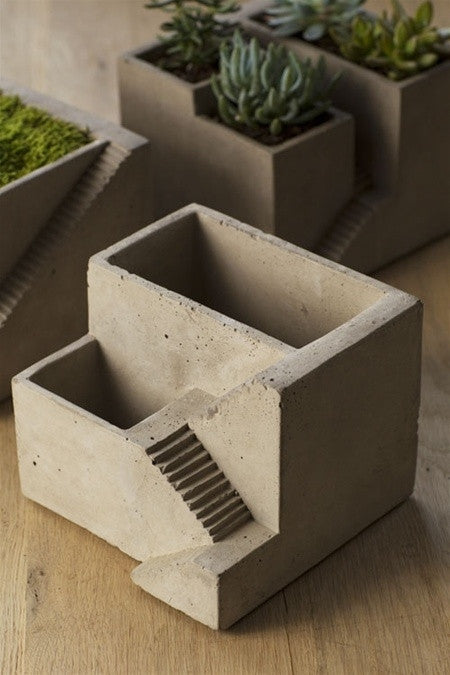 One of our most popular items, our simple yet intriguing cement planters feature a staircase design. Reminiscent of a creation by M.C. Escher, this is sure to be a great conversation piece.