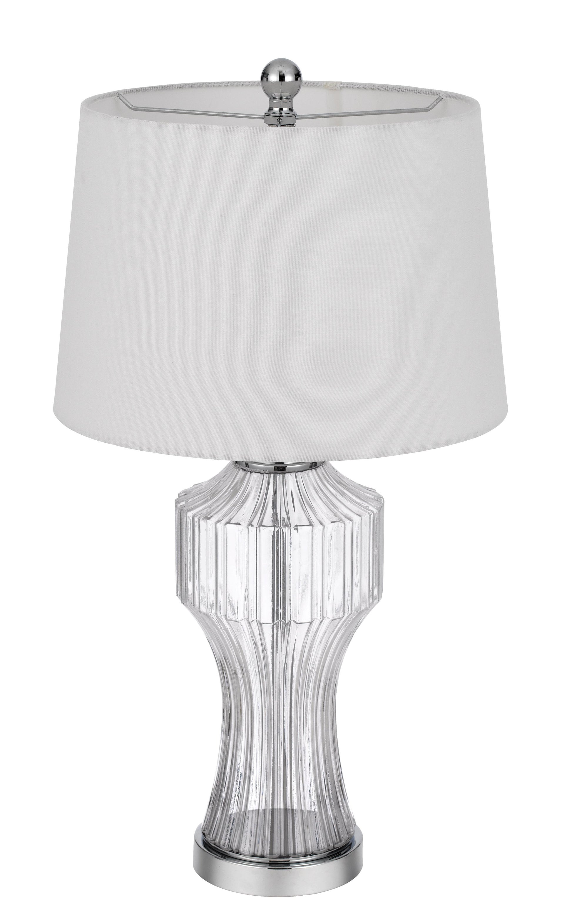 Bring of level of elegance and freshness to your space with this high quality 26" clear glass table lamp with white empire shade. The base of this lamp is made of glass finished in a clear tone. The white empire fabric shade is finishes this piece off nicely and symmetrically This standard table lamp is designed to provide general lighting to the area. Use this lamp anywhere and elevate the look of the whole space. The perfect lamp to create just the right natural and soothing light in your space. 26" H x 14" W x 14" D