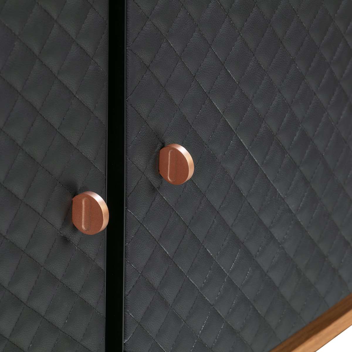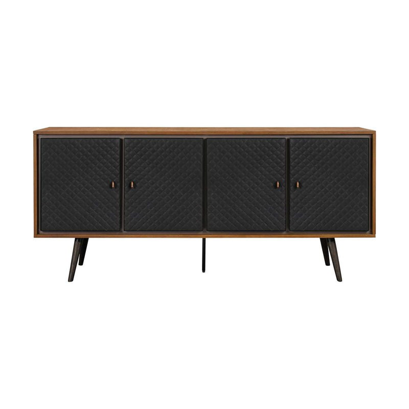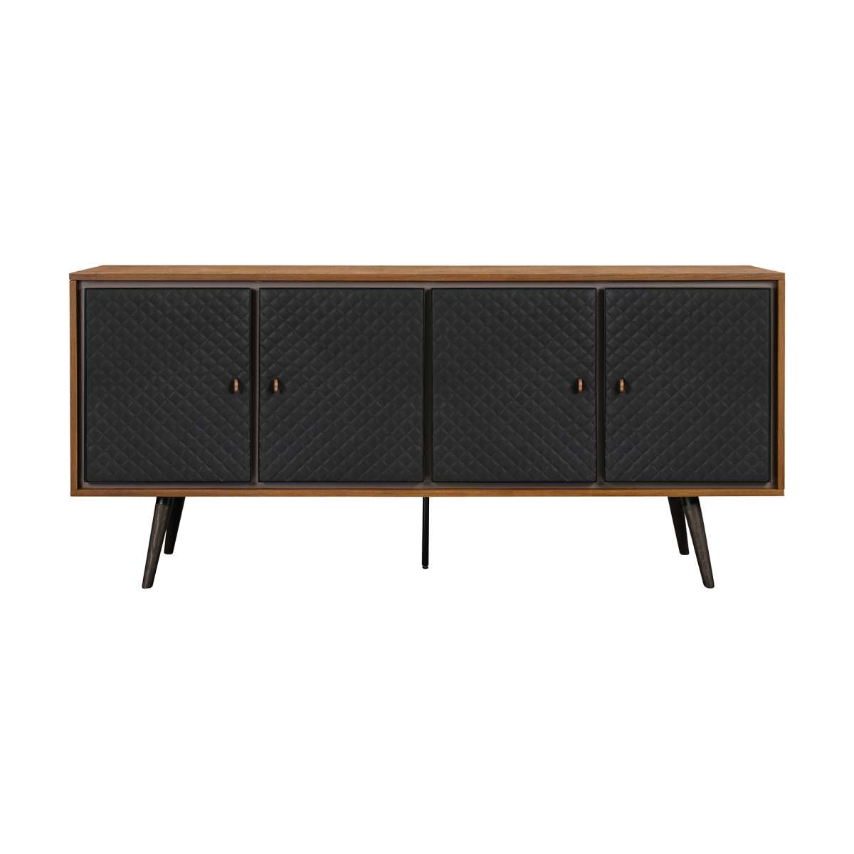 Offer up a touch of rustic and modern look to your dining or bar area with this Armen Living Coco sideboard cabinet. It is a perfect piece for your traditional welcoming space or bedroom. The wood top design features a rustic wood grain look that goes along the sides. The four tapered leg base is designed for sturdiness and durability. This spacious sideboard features 4 cabinets with soft close function. The front exterior details are tufted with diamond stitching design in black faux leather. This sideboard will make a simple storage solution to any well-appointed space in your home. Perfect as a sideboard, credenza, buffet cabinet or display stand and can also accommodate flat-screen TVs up to 60" wide as a living room or lounge area TV stand. This item is a part of the Armen Living Coco Bedroom collection but can be mixed and match in any modern style home. We stand by the quality, the craftsmanship, and the integrity of our product by offering a 1-year warranty for all our products. We want our customers to enjoy our product and we will always be there to help with our top-notch customer service support.