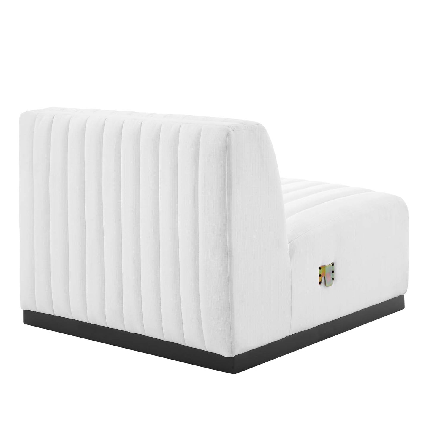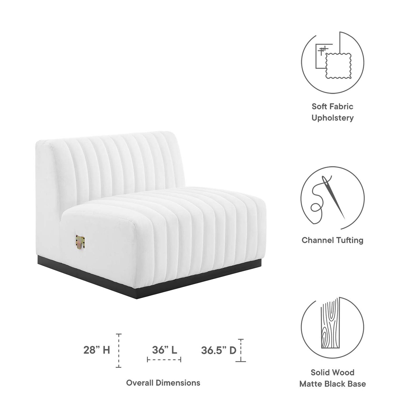 Modern appeal surrounds the Conjure Channel Tufted Upholstered Fabric Armless Chair. Soft and durable fabric upholstery covers dense foam padding and an individually wrapped spring coil system for a supportive living room chair that will become the go-to lounge spot for family and friends. Vertical channel tufting and subtle French piping adds depth to this vintage inspired sectional piece that effortlessly becomes the focal point in your living room. Solidly constructed from wood and plywood, this chair features non-marking foot caps and boasts a matte black base. Versatile and elegant, this sectional sofa piece is ideally suited for a variety of decor styles in your living room, lounge, or home office. Chair Weight Capacity: 331 lbs.