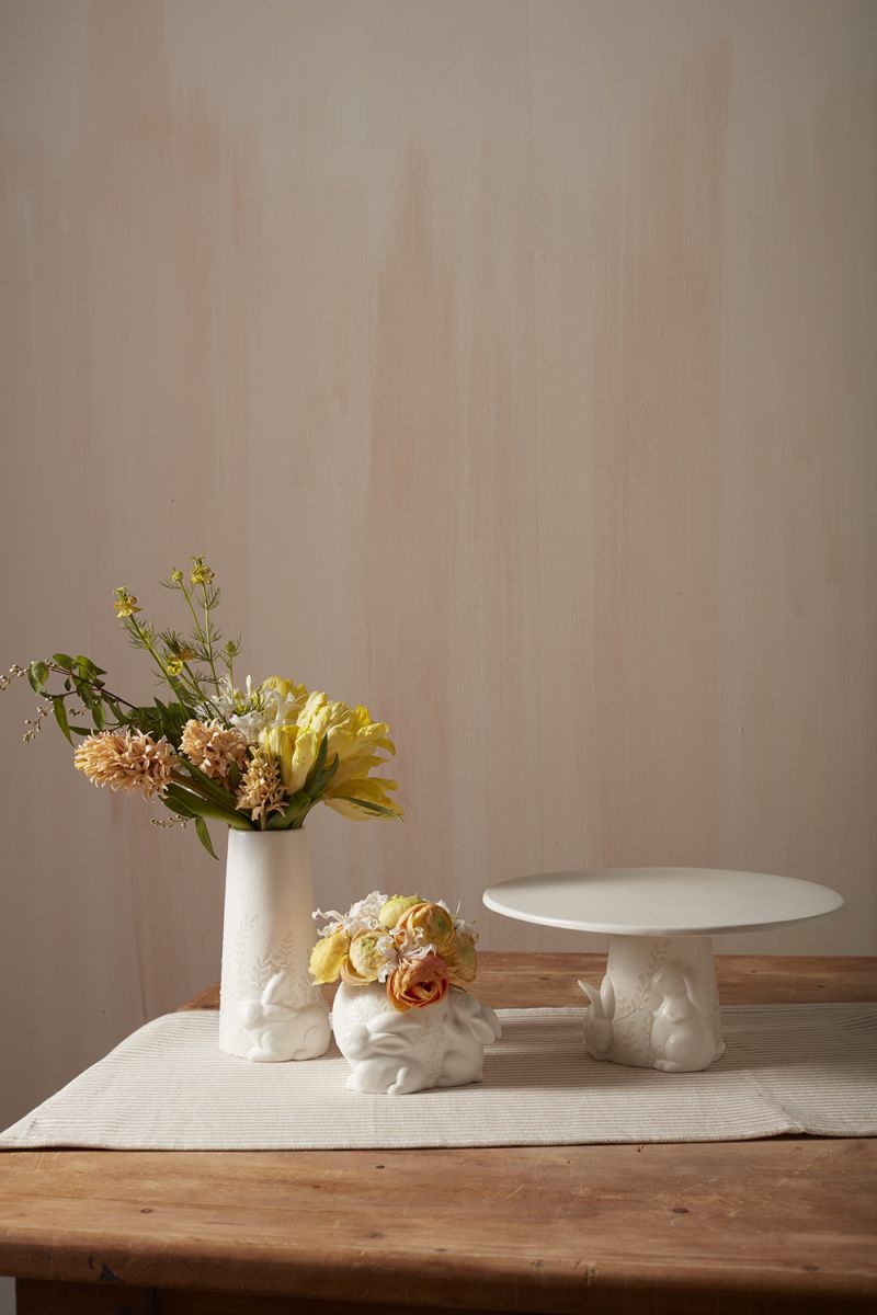 Bring a whimsical, vintage-inspired garden to the table with the ceramic Cottontail Collection. Wrapped around the base of the plate are charming bunny shapes with a detailed leaf pattern. Serve sweets & treats on the elevated platter.