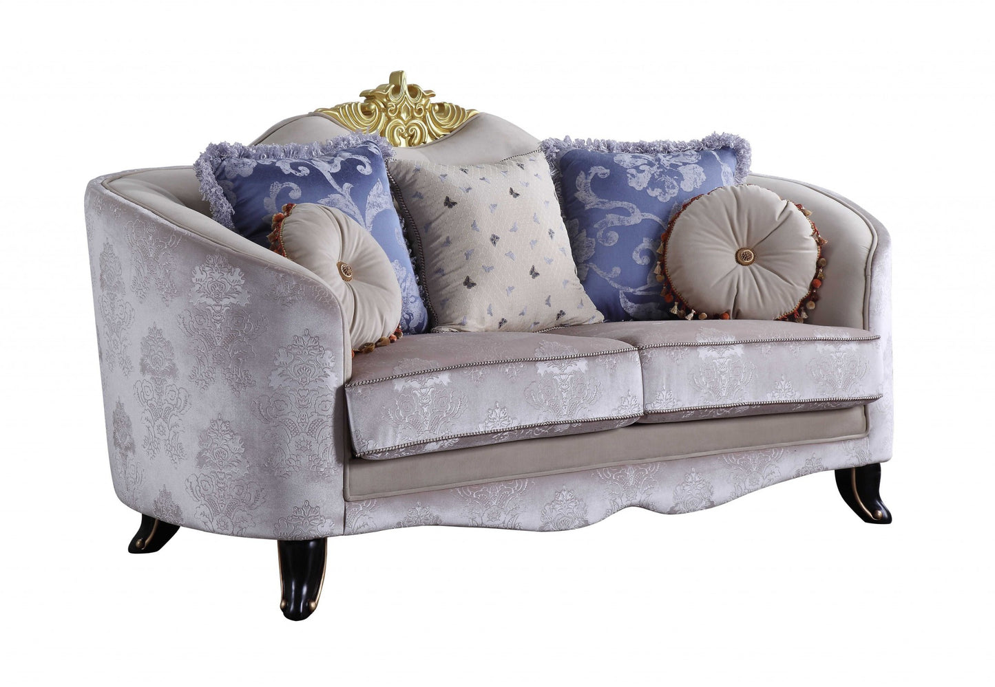 Comfort and luxury redefined! This loveseat is wrapped in super velvety cushions which makes lounging an absolute delight. It is carved from tough pieces of wood, and decked with an array of decorative and functional detailing. Starting from solid wood molding crown along with a tight back and loose seat cushions in classic cream fabric upholstery. Arched backrest and curved arms gives the sofa a modern appeal, it also makes the seat compact and space saving. To garnish up everything, this chair is accompanied with 5 stunning accent pillows. If youre thinking of purchasing a high class modern sofa with perfect upholstery for your living room; then this will definitely be the best option. Available in the size of 38 by 76 by 43 inches.