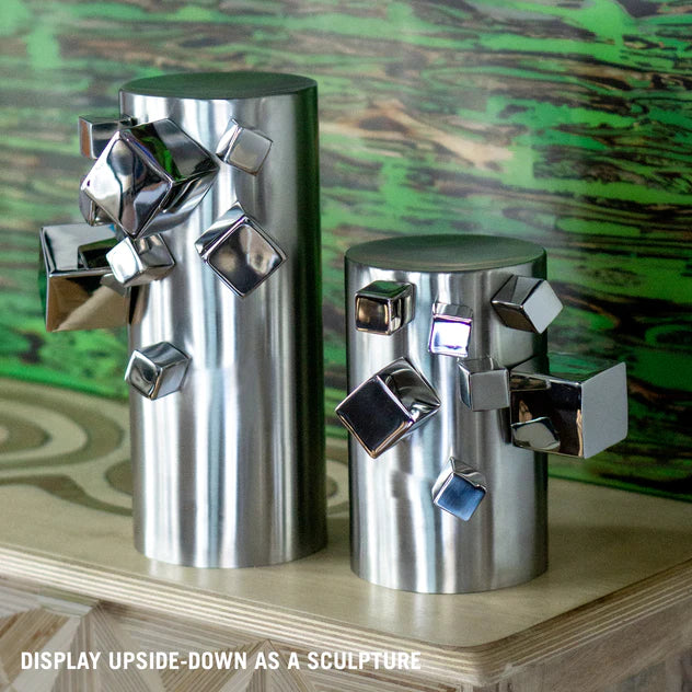 Imagine the endless possibilities. Doubling as a vase and a sculpture when upside down. Group multiples for a striking display. Crafted by hand, the attractive thick gauge stainless steel vase is brushed with a variety of polished three-dimensional cubes suspended on one side. Outdoor friendly but could slightly corrode with time especially in salty environments. Liner required. Protect table surface. Two sizes available.