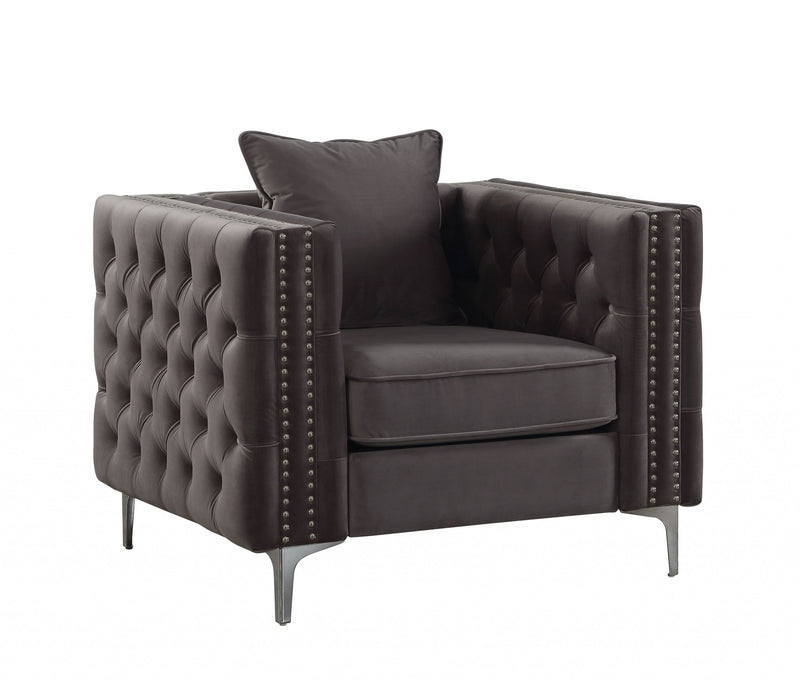 Update your living room with this vintage styled velvet chair. This charming cushion seat is furnished to conjure state-of-the-art comfort and luxury in any setting. The elegant construction features an extravagant seat cushion and it comes with button tufted arm and back accented by nail-head trim. Our magnificent piece is upholstered in dark gray velvet upholstery that resonates an enduring beauty and style. Its stunning accent pillow and high shelter arms pep up the overall design with sumptuous feel and exquisite elegance. The fully padded chair rests in complementary fashion on metal bracket legs in chrome finish for long-lasting use. It has a weight capacity of 250Lbs per seat.