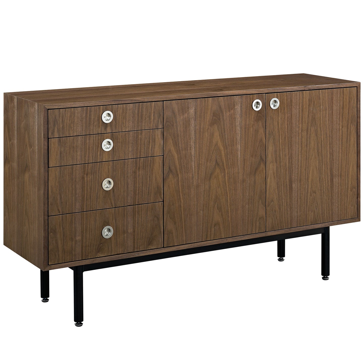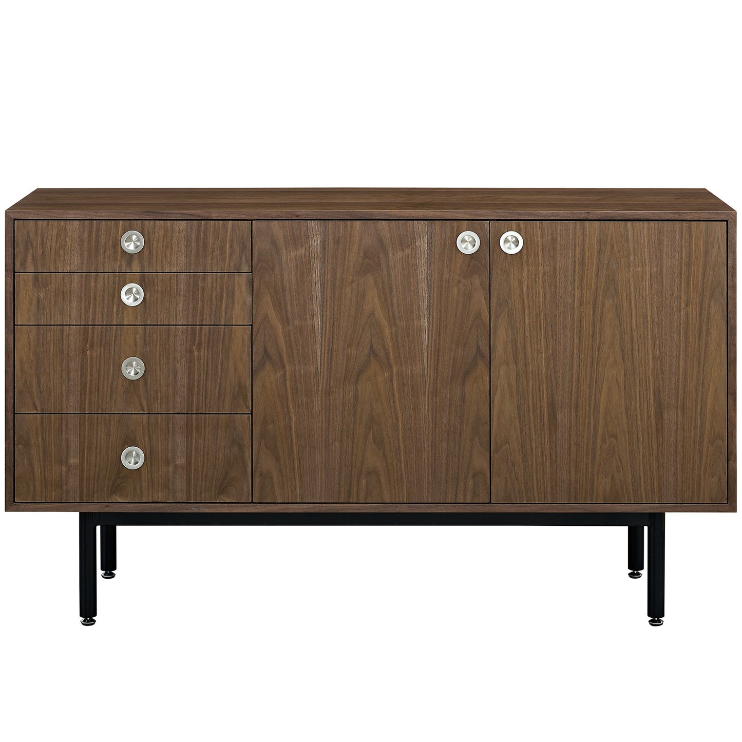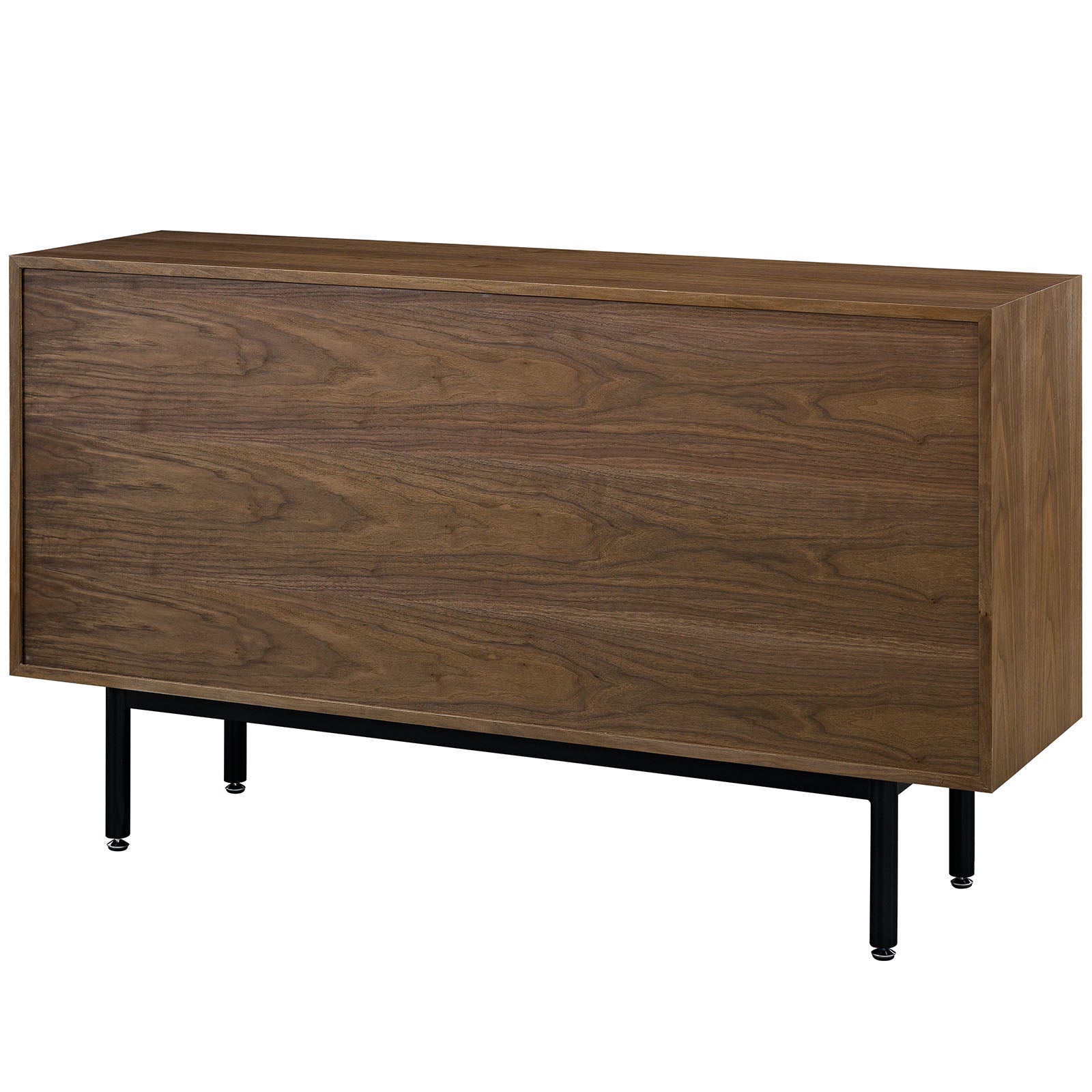 Engage your mid-century modern sensibilities with the Delegation Flat Screen TV Stand or Sideboard Cabinet. Meticulously crafted with four full-extension drawers on two storage shelves concealed by two hinged panel doors, Delegation was designed to be a multipurpose addition to your living room. Made of high-grade MDF particleboard layered in smooth walnut wood veneer and positioned on a powder-coated steel frame with brushed stainless steel handles, Delegation is a quality stand or sideboard perfect for holding big flat screen TVs up to 60” or your favorite memorabilia. Delegation features painted sliding doors with a boxy frame and non-marking foot glides for a playfully optimistic piece with clean lines and iconic look.