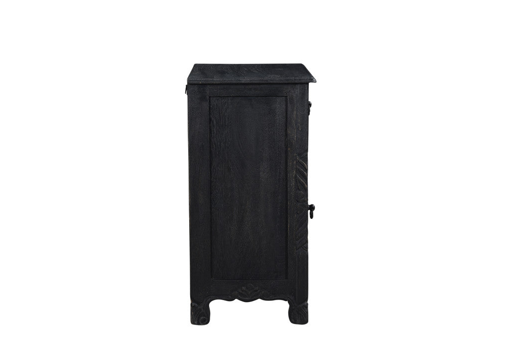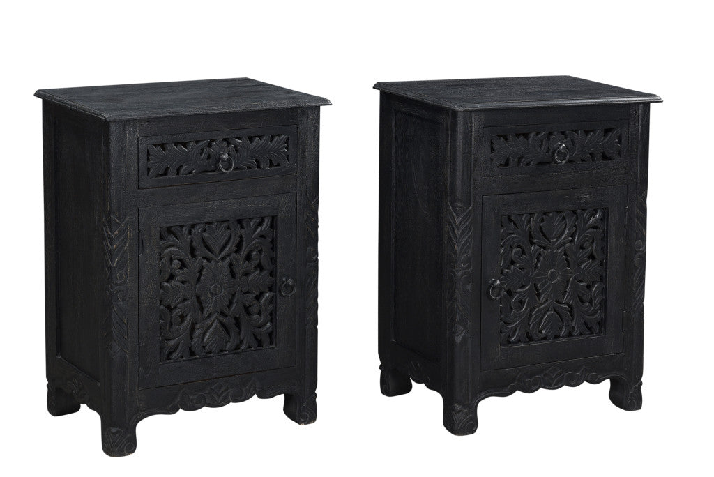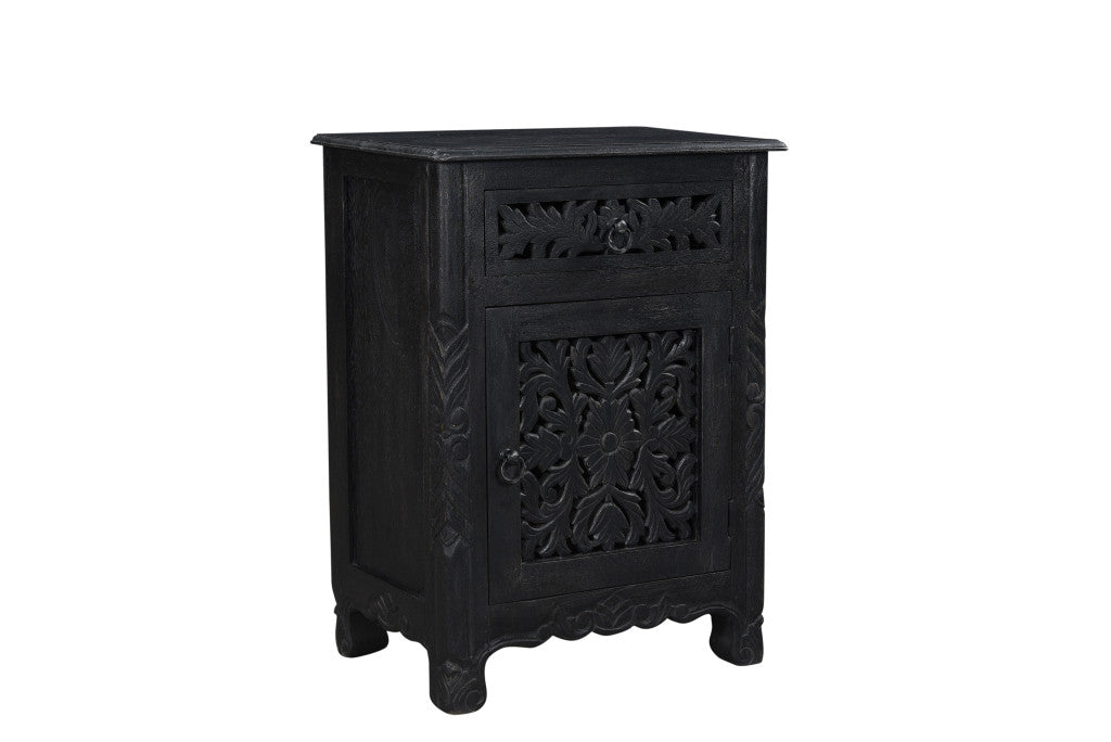 Give your room the look and feel of 5-star accommodations with this 30-inch distressed black one drawer carved floral solid wood nightstand. Sturdy and durable construction from solid wood ensures this trusty bedside table is built to last. Includes a drawer and cabinet to help keep your essentials close by and hidden. This piece is purposefully distressed and finished with a whitewash to give a worn, rustic/vintage finish. The unsung hero of the bedroom, this nightstand is perfect for keeping a glass of water, lamp, alarm clock, jewelry, and more, close by and easily accessible. 30-inch H x 22-inch W x 15-inch D
