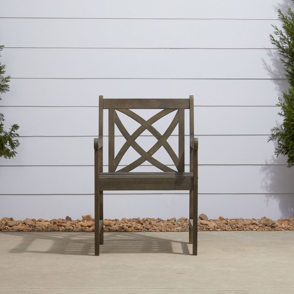 This Distressed Patio Armchair with Decorative Back is the perfect outdoor accessory. Sit comfortably with style in this sturdy and elegant outdoor armchair with arm rests. This chair is perfect for lounging by the pool or reading a book on your patio. The beautiful distressed grey finish gives a fun, updated outdoor feel to your seating area. This chair is made from 100% premium quality Acacia hardwood that is prone to resist mold, mildew, and decay. 34" H x 24" W x 24" D.