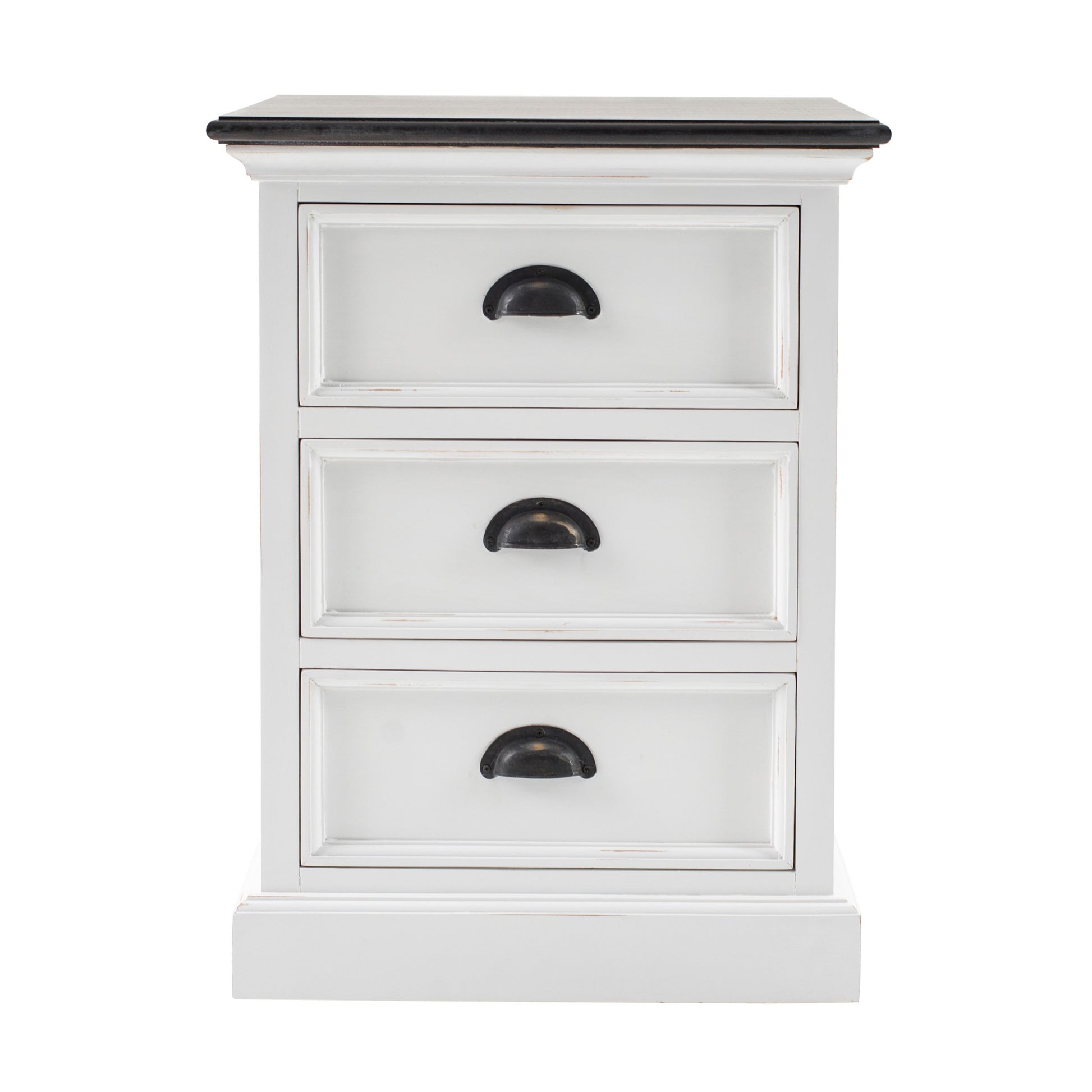 Exquisite in design, the Distressed White and Deep Brown Nightstand can compliment any decor or space. Ideally fashioned for the bedroom, this table can also serve as a side table in your living room. Handcrafted from kiln dried solid mahogany wood with a white distressed paint and deep brown finish, it is compact to fit into narrow spaces. The table is equipped with three equally spaced out drawers with mild intricate carvings and antique brass hardware cup pull handles for easy access. Crown moldings adorn the edges of the smooth table top which is perfect to store your favorite book or reading lamp. Add a dash of elegance and sophistication to your home with this stunning brown and white bedside table that definitely serves it's purpose. 23.62" x 17.72" x 17.72"