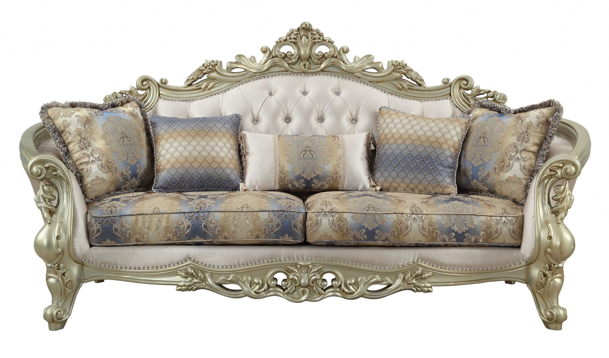 Exclusively designed and filled with romantic spirit, this beautiful sofa features legs and carved aprons and trims, decorated with raised and scrolled floral motifs in an antique champagne finish. Each piece of this sophisticated living room set boasts of curved and rolled arms, oversized molding and crystal-like button tufted backrests with nailhead trim. This three piece collection with contrasting accent pillows will bring sophistication to your living room and will add elegance to any room decor.