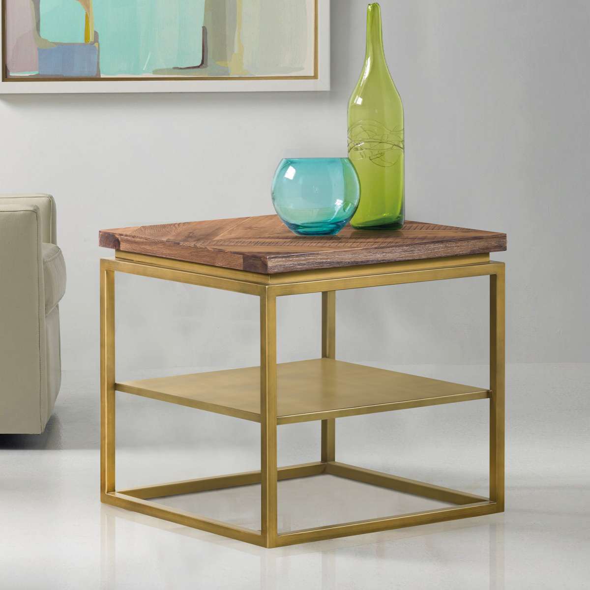 This Armen Living Faye wooden top side table are versatile piece that will blend into any modern contemporary style home. The bottom metal structure accompanied with solid wood top add sturdiness to ensure durability of this product, while the antique gold metal accent add a touch of glam yet modern twist to any home. This square side table offers enough shelf space for you to conveniently keep coffee cups, remote controls, magazines, or a laptop.