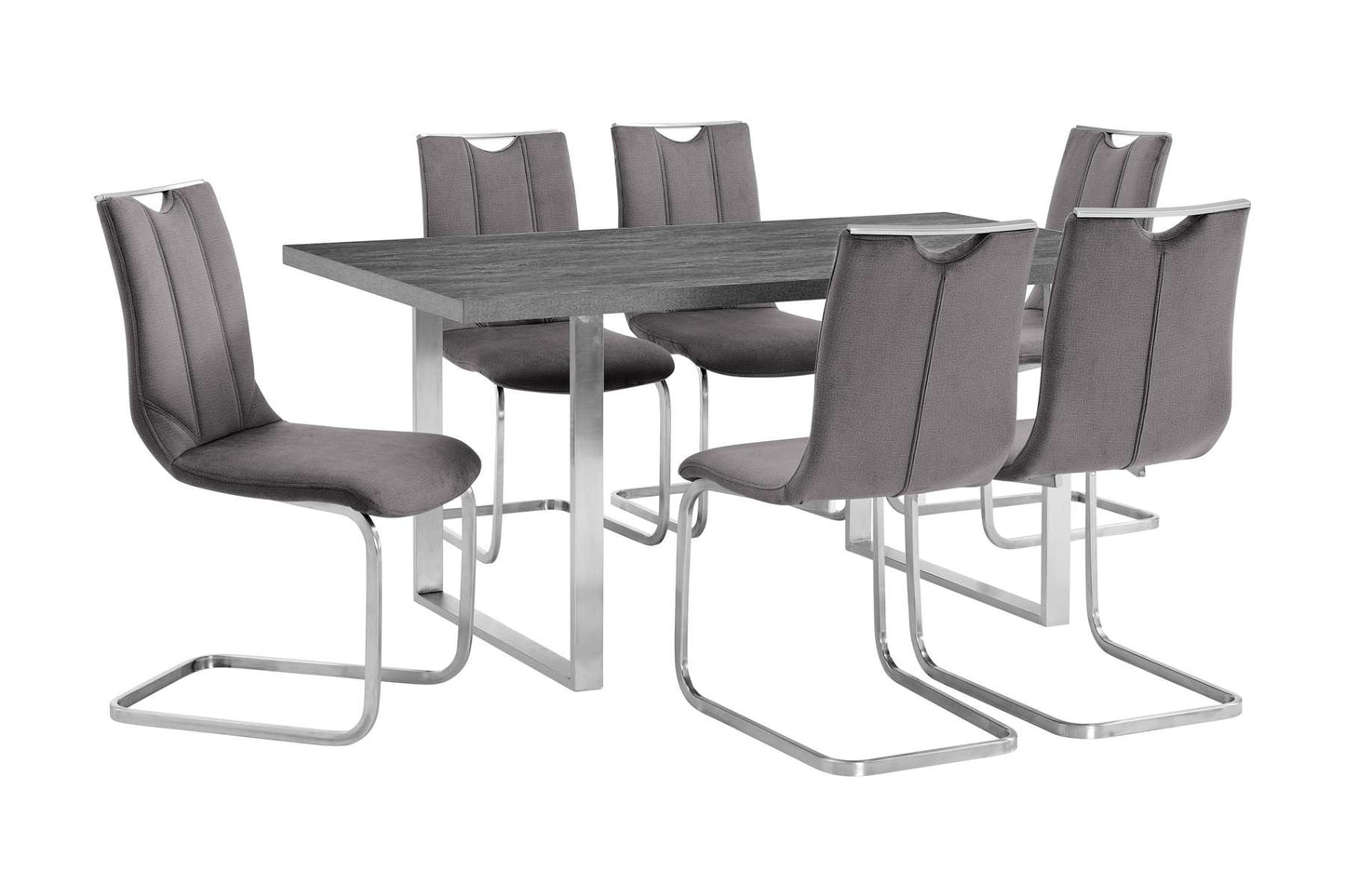 The Fenton and Pacific 7 Dining Set in Gray Faux Leather from Armen Living is the best new addition to bring into your beautiful home. The ergonomic seat back is designed with your comfort and posture in mind - no back pain! The sled leg design offers incredible stability and safety. The Pacific features a convenient handle at the top of the seatback, which makes carrying from room to room a breeze! This wonderful chair features a sturdy metal frame that assures dependability and will give you years of enjoyment. The thick tabletop of the Fenton is wide and sturdy - allowing you to entertain guests with ample space and never having to worry about the stability of the table. The refined geometric shapes displayed throughout this piece of furniture will offer your home a truly sophisticated look.