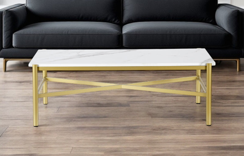 Make a statement with the 46-inch gold faux marble and steel coffee table and infuse a dash of character and personality into your space. A solid gold steel frame is finished off with a matching gold faux marble top, giving this table a chic monotone look. This rectangular table is an classic yet updated way to accent your room. It has a fresh design that will definitely breathe some fresh air into your interior. This coffee table is the sturdy, reliable and stylish answer to your living room needs. 16-inch H x 46-inch W x 20-inch D