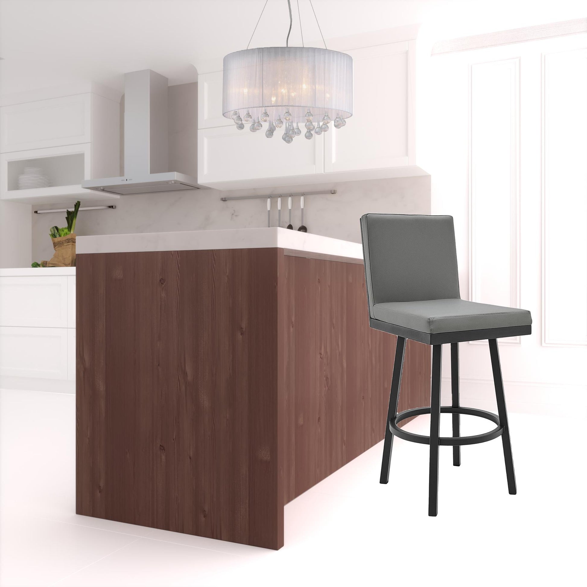 This 30-inch gray and black faux leather and iron swivel bar height bar chair with footrest will be the perfect way to add some cool design and utility to your space similar to what you find in your favorite cafes or pubs. The black coloration of the high quality iron base marries nicely with the gray faux leather seat. A full back mixed with a round shaped seat design makes this chair both comfortable and fashionable. Designed with a footrest for comfort and convenience. 44-inch H x 19-inch W x 23-inch D