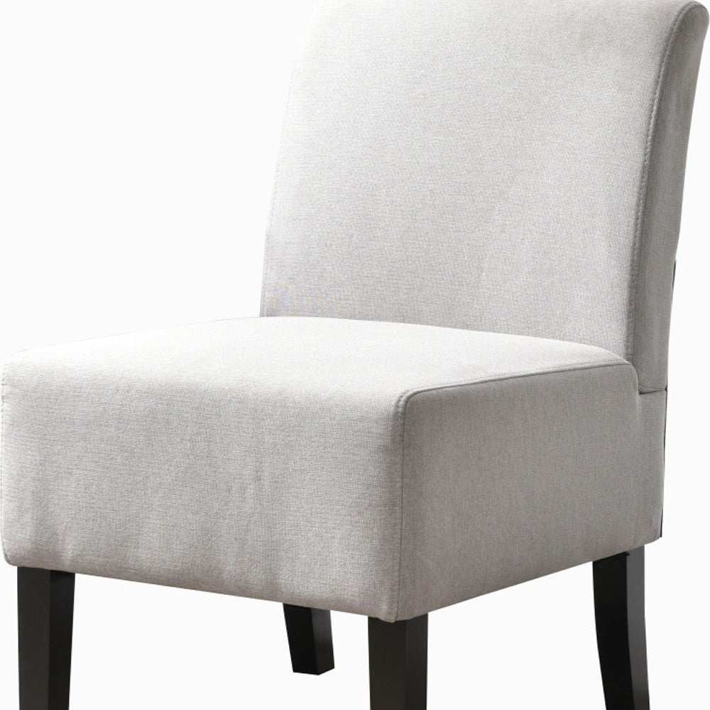 Unique and decorative, this 23-inch gray and black upholstered slipper chair will leave a lasting impression. This gorgeous solid color gray slipper chair is masterfully upholstered in durable 100% polyester. The sturdy inner frame is built with high quality solid and manufactured wood, featuring a fixed back that is accented with soft and comfortable cushioning. 33-inch h x 23-inch w x 23-inch d.