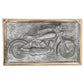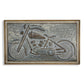 | Horizontal wall decor featuring a motorcycle design crafted from wood and metal. |