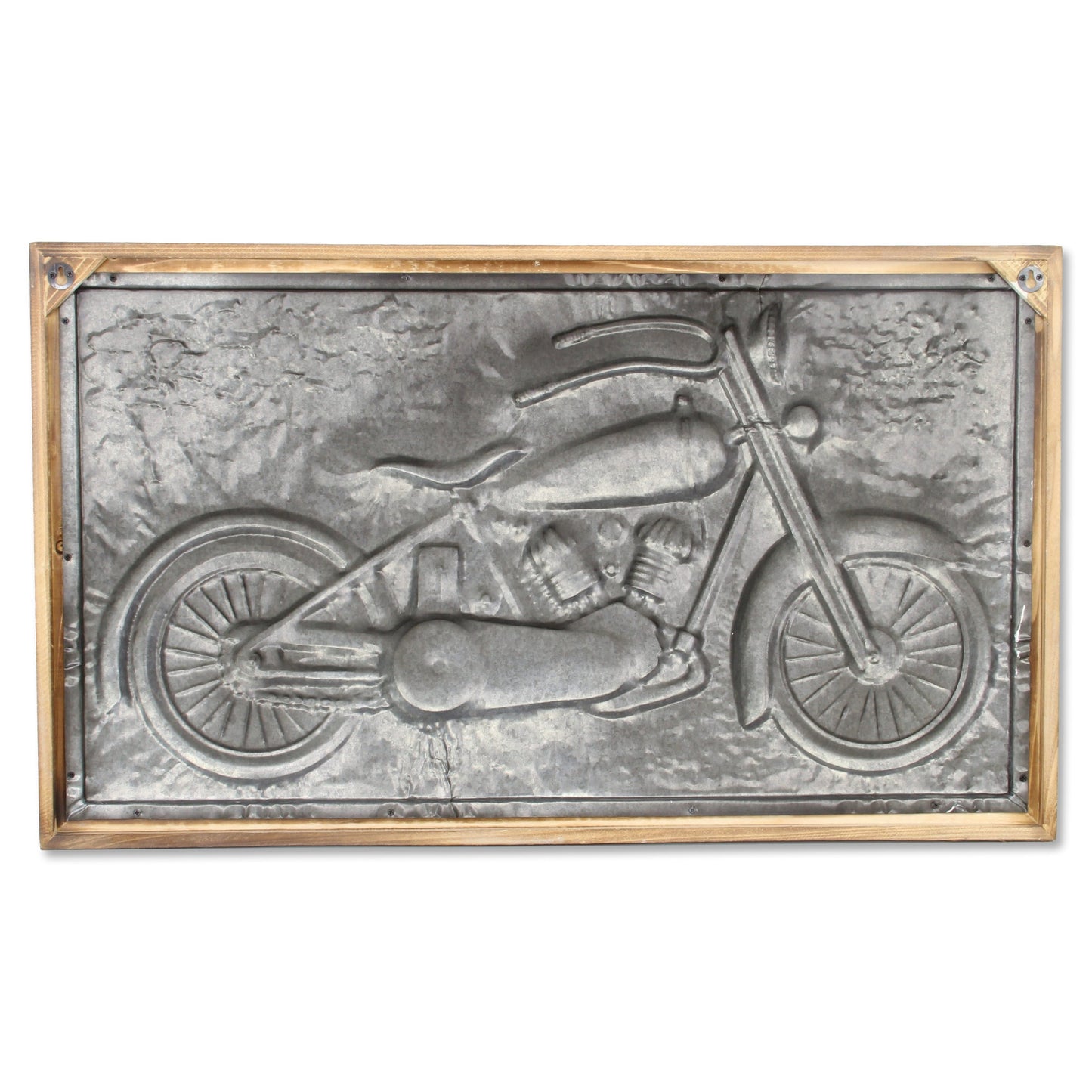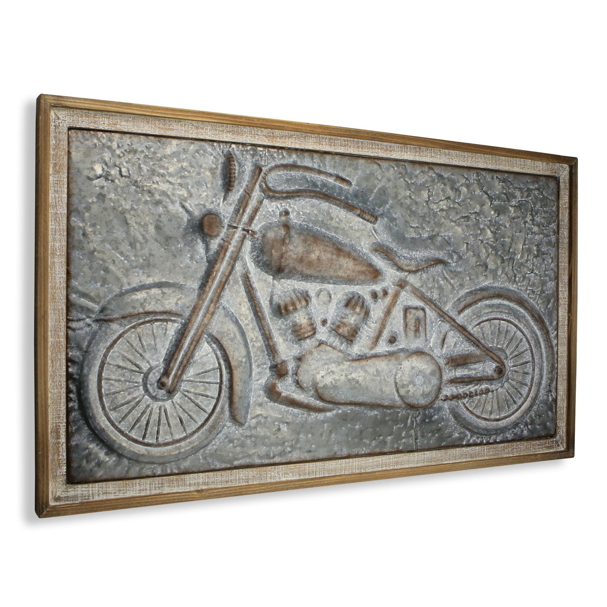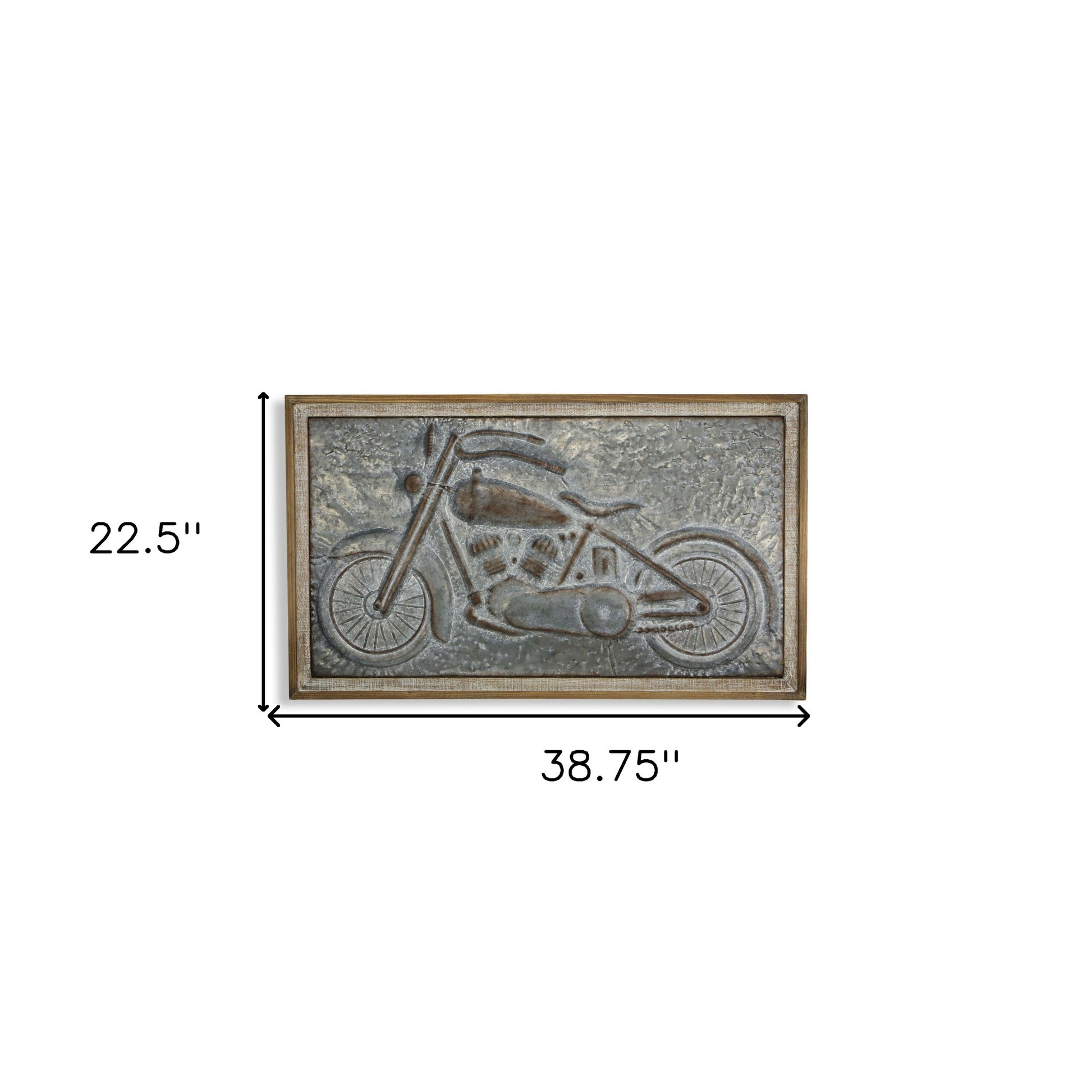 The 23-inch x 39-inch gray and brown wood and metal wall decor is the perfect decorative accessory for your home. Handmade with care, this piece brings some authenticity to your space. With materials and a finish that is purposefully distressed, this hanging wall decor will instantly liven things up and bring color and dimension to your walls. This transportation inspired wall art features a motorcycle icon and will bring a refreshing look and perspective to your walls. 22.5-inch H x 38.75-inch W x 2.5-inch D