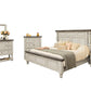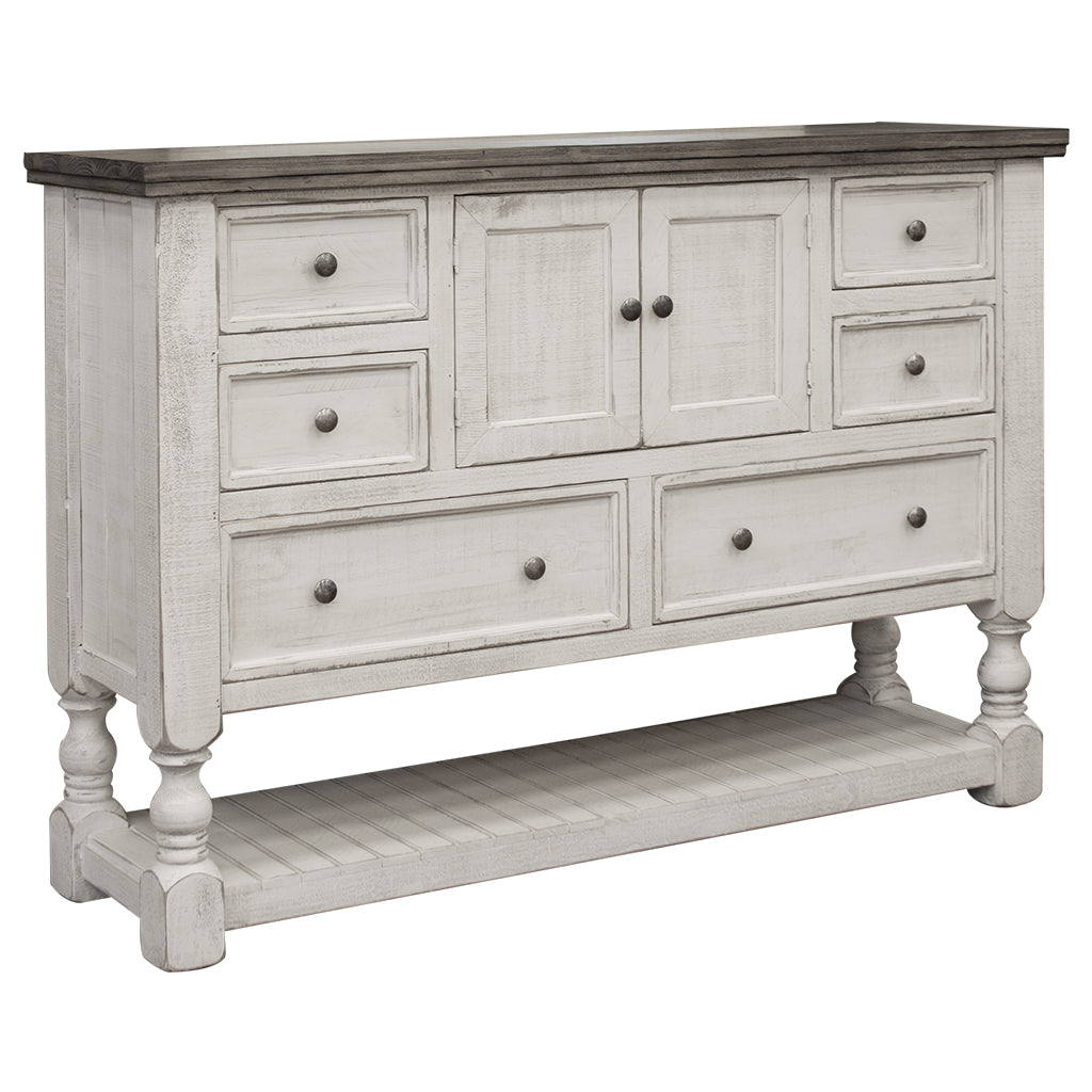 | Two tone, multi-step lacquer finish. Top features weathered gray finish on hand-distressed wood. Eggshell antiqued finish on the case |