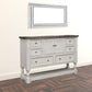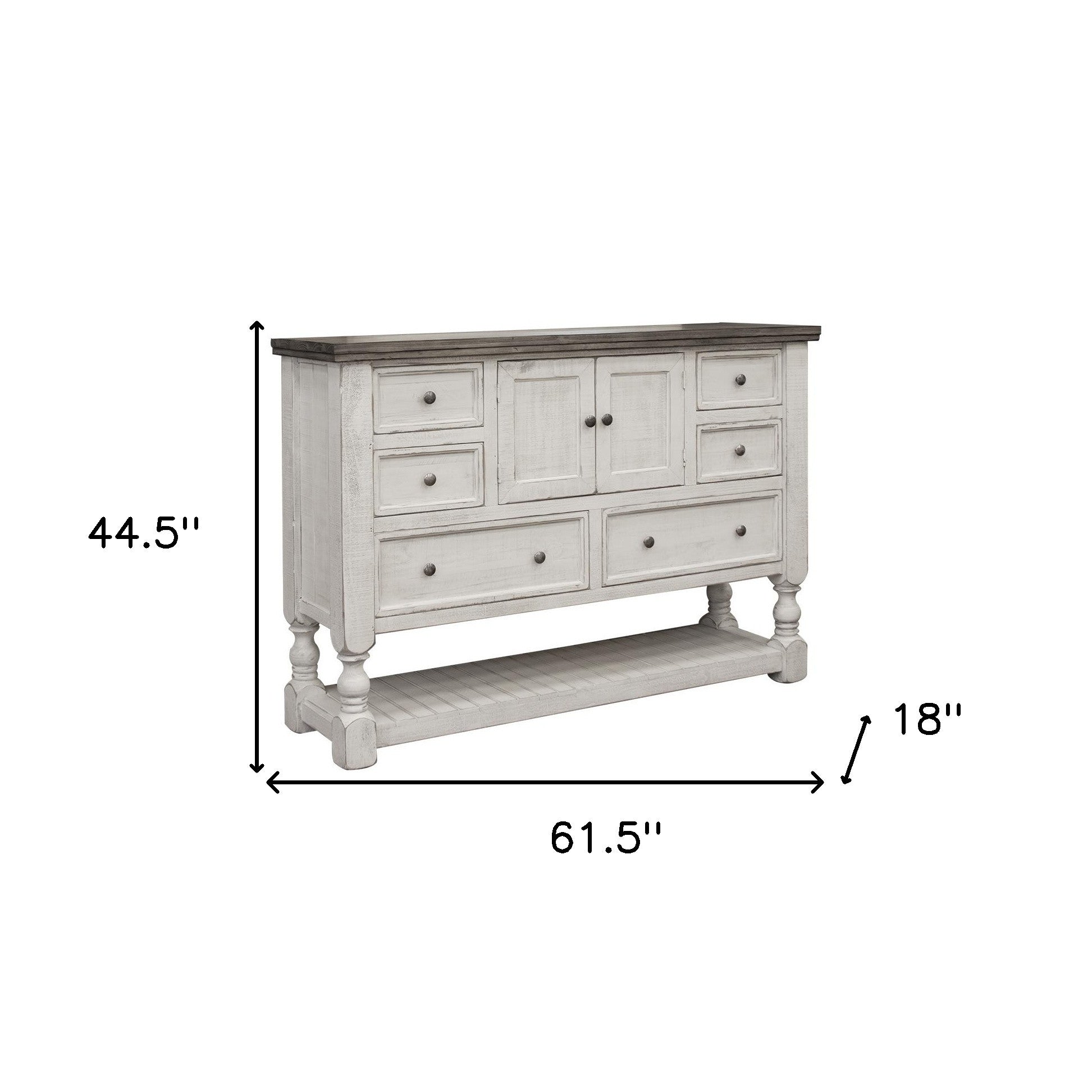 Add personality to your bedroom style and a feeling of coziness with this 62" gray and ivory solid wood six drawer triple dresser. This horizontal triple dresser has column style drawers and a wide top surface area to help you with your daily dressing essentials. Loaded with capacity, this piece is equipped with six easy open drawers for practical and good looking clothing storage. This dresser is built to last from high quality solid wood,. 44.5" H x 61.5" W x 18" D