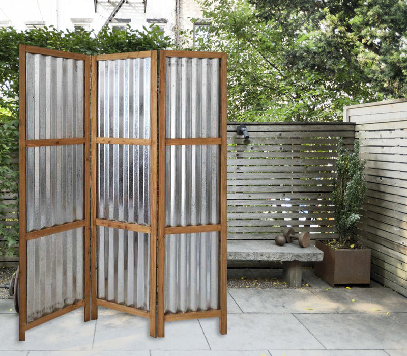 Create a unique and modern look with this Gray Industrial Galvanized Metal Three Panel Room Divider Screen. The updated casual screen features wood and galvanized steel that gives it an earthy and edgy look. Slightly distressed and rustic this modern industrial look is all the rage. 72" x 60" x 1".