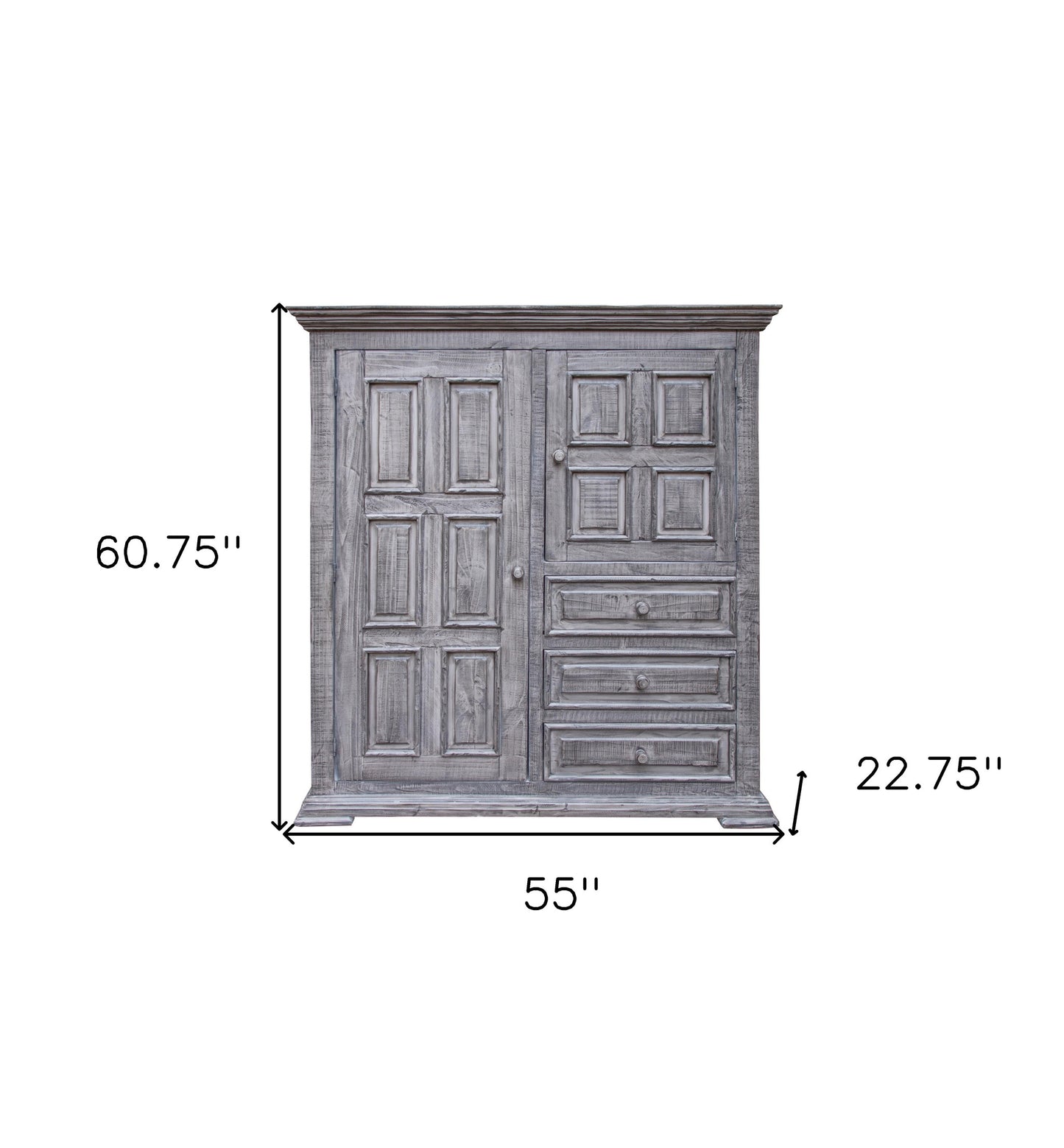 Add personality to your bedroom style and a feeling of coziness with this 55" gray solid wood three drawer gentlemans chest. The space saving design of this gentlemans chest makes it a great choice for space challenged spaces or small walls within your room. Equipped with three easy open drawers for practical and good looking clothing storage. This dresser is built to last from high quality solid wood, The gray coloration of this piece is neutral and will blend easily with most any decor. 60.75" H x 55" W x 22.75" D