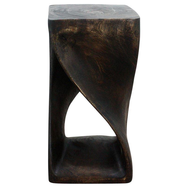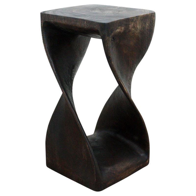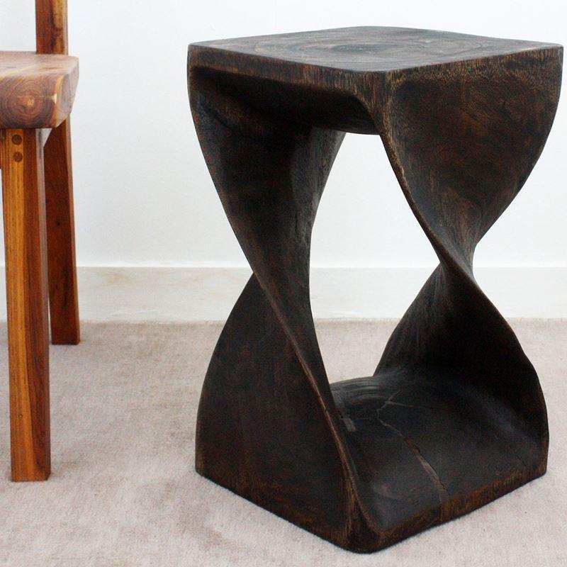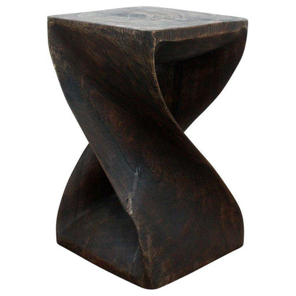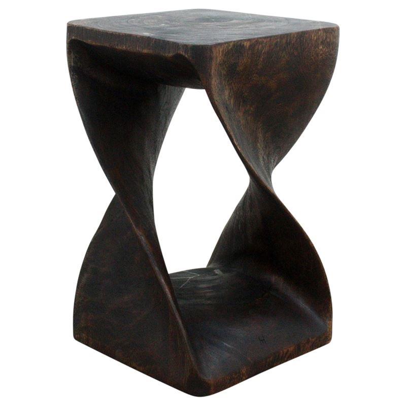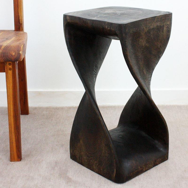 Hand-carved and completely eco-friendly is this Twist Stool is 12 inches square by 20 inches high To make the Mocha look we coat first with Livos Chestnut Oil which is a rich brown with red tones and then a top coat of Black oil The beauty of this design lies in its simplicity. It™s bold, yet gentle, rustic yet refined. One quarter twists support this elegant piece, which can serve as an end table, display stand, or stool for last minute seating. Nature™s creations are always in style; this dramatic accent piece is a stylish complement to both traditional and contemporary settings.