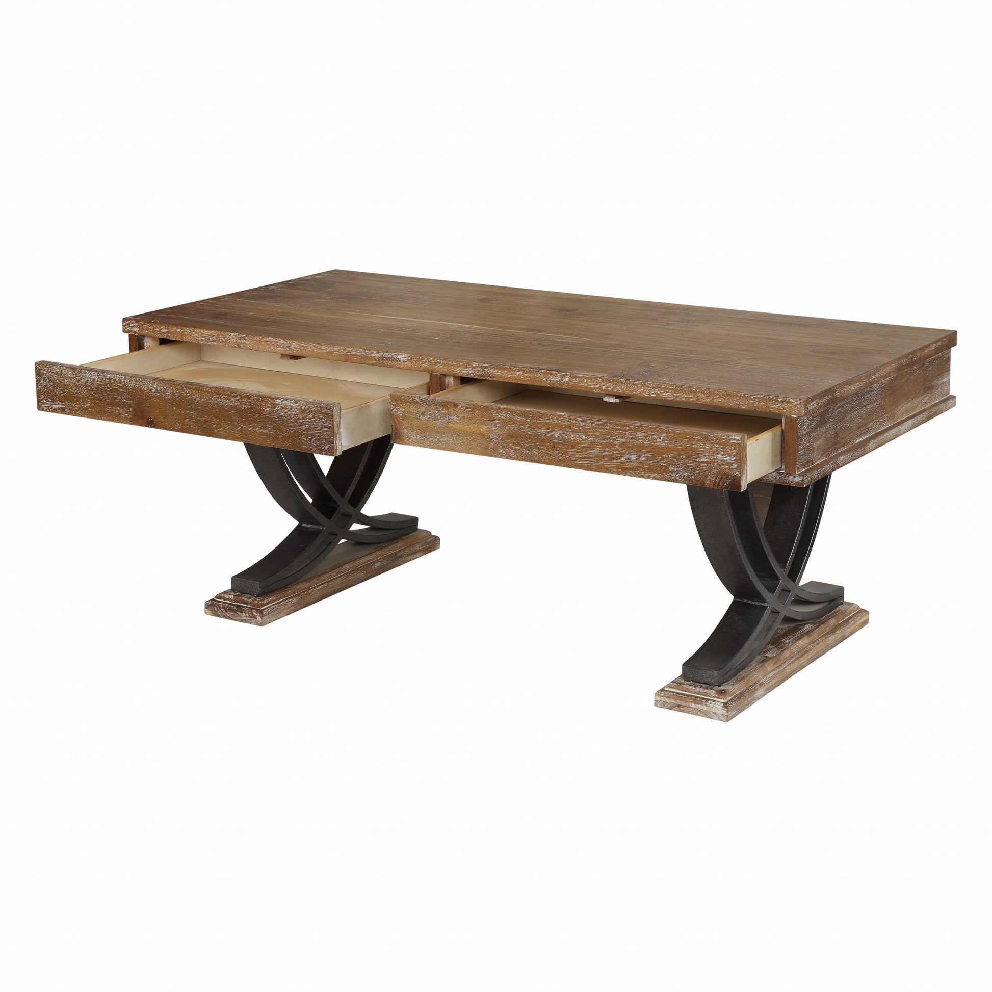Expertly crafted, stunningly streamlined! Incorporate this traditionally handcrafted coffee table into your space for a classic presentation. It works well when placed in the center of the living room or next to a chair or sofa. This table is constructed with durable wood and metal materials, and is embellished with superb natural finish veneer. The table flaunts a wide table top which provides sufficient place for one to place anything from mugs, beverages to newspapers. It comes in the size of 24 by 48 by 20 inches. Distressed, natural finish oak over black metal, this table is certain to leave an air of modern finesse in any space. It is finished in alluring antique oak and black and has two pull out drawers for hidden storage - perfect for those remotes and coasters!