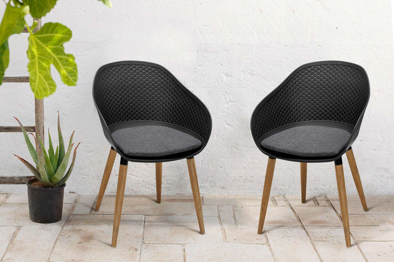 Bring the Ipanema Outdoor Dining Chair with Teak Legs and Dark Grey Olefin - Set of 2 from Armen Living into your outdoor or indoor living space to complete the look you have always wanted. The ergonomic chair back of the Ipanema helps your back maintain the best position possible. The plastic seat is comprised from 100% virgin polypropylene and contains no harmful chemicals and can be recycled without producing waste or damaging the environment. The Ipanema dining chair features a removable cushion upholstered in olefin fabric which maintains multiple properties including abrasion, stain, sunlight, fire, and chemical resistance - perfect for leaving outside! This contemporary chair is primarily designed for outdoor purposes but can also be used indoors giving your home a modern touch. These chairs are sold as a pair and can be combined with the Ipanema Outdoor Aluminum Dining Table in Dark Grey with Natural Teak Wood Accent from the same collection! Product Dimensions: W:22 x D:21 x H:32 x SH:17