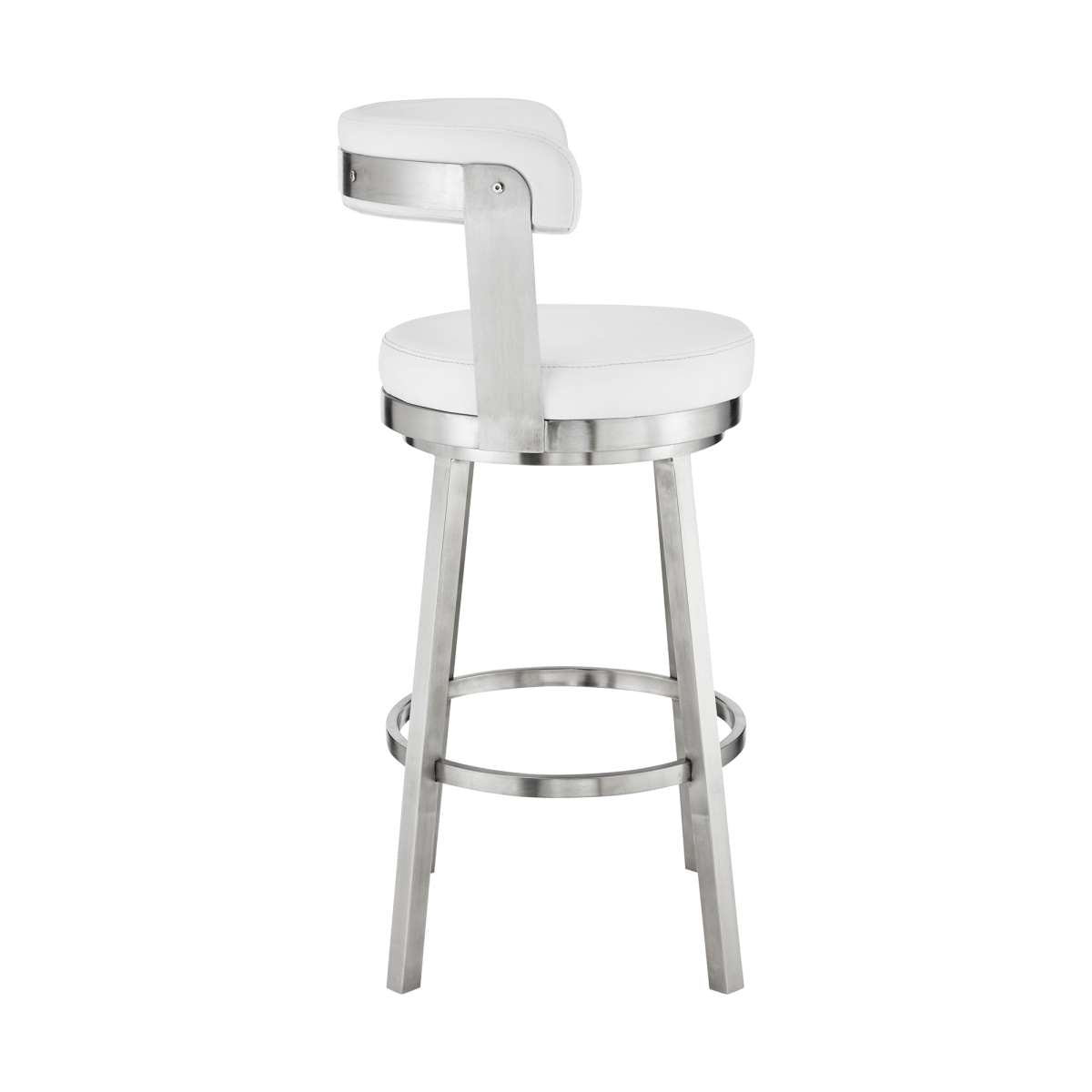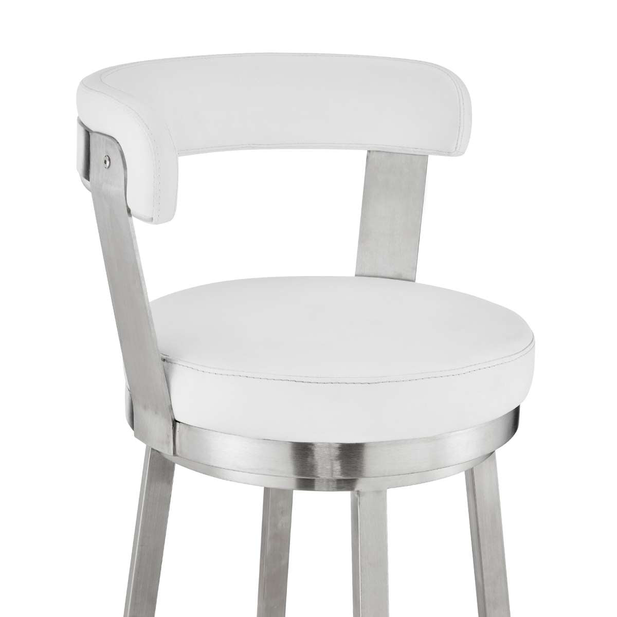 Kobe 30" Bar Height Swivel Bar Stool in Brushed Stainless Steel Finish and White Faux Leather By Armen Living