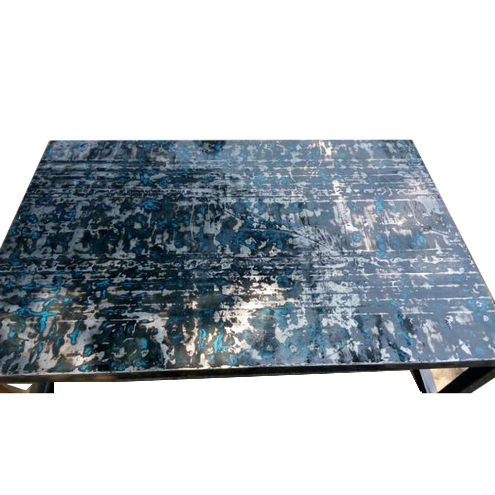 Recycled metal coffee table, hand crafted out of metal from old salvaged oil drums in brown and blue with glossy, smooth polish over the natural ochre swirls of the base mineral in the fossil.