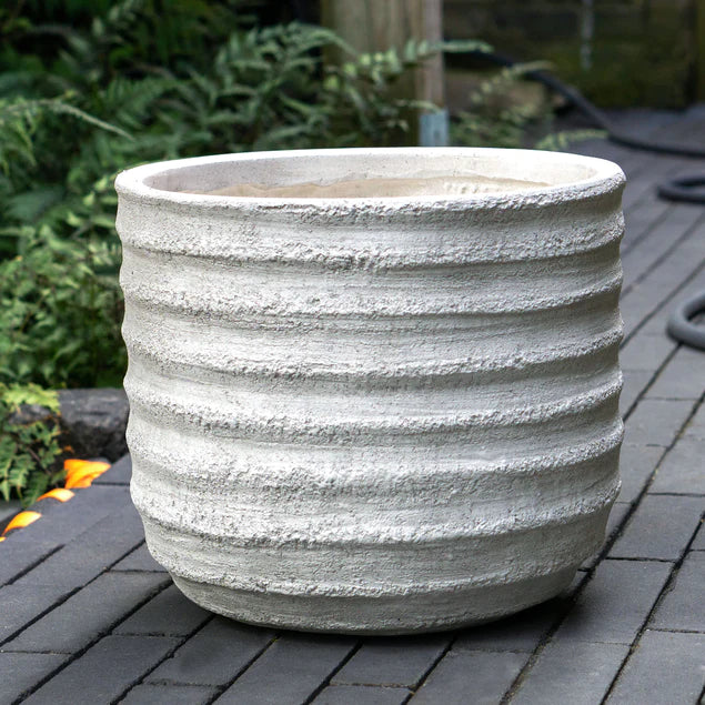 Part of our outdoor and indoor trendy Dolma planter collection, each piece offers a handmade artisan texture in a 'chalky' white finish. This item is the smallest size of the original set. Using a blend of clay and fiberglass offers durability and less weight. For outdoor use with winter environments, proper drainage holes are required and can be easily drilled. Color blotches, exposed air bubbles, mold lines and chipped edges are not defects but meant to imitate aged pottery. Changes with color are possible with age and exterior elements. Liner required for indoor use. Protect flooring beneath planters.